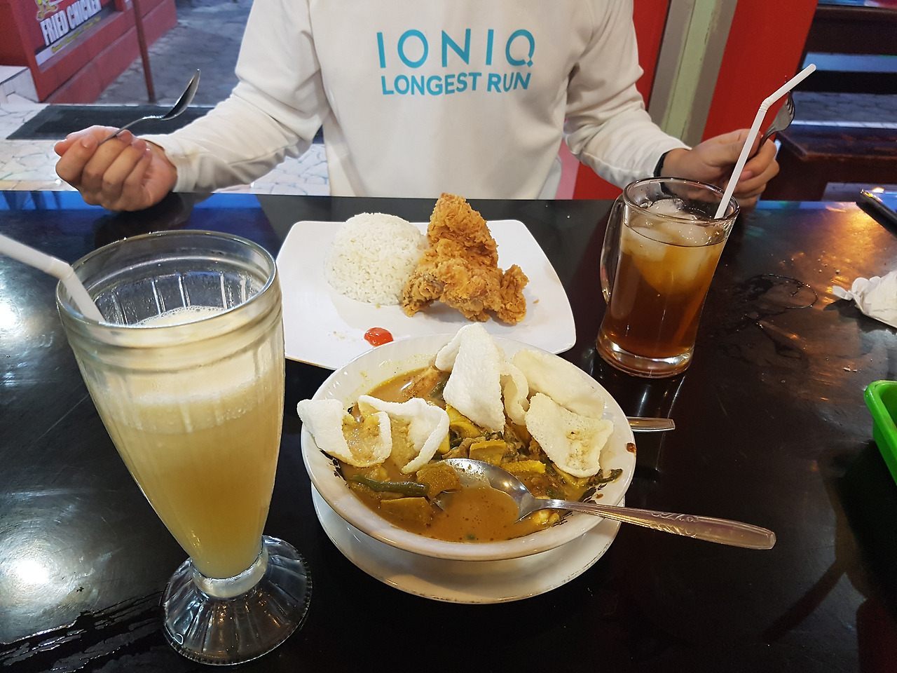 숙소 적응을 마친 뒤 주인장의 안내에 따라 큰 거리에 있는 식당에 가서 저녁을 먹었다. 사진에 보이는 그릇에 담긴 음식은 이곳에서만 맛볼 수 있는 메뉴인데, 우리나라 곱창전골 맛이 났다. 안에 들어있는 재료들도 순댓국에 들어있을 법한 것들이었다. 나는 입맛에 잘 맞지 않아 남편이 거의 다 흡입했다. 그리고 후라이드 치킨을 먹었다. 아주 바삭하니 맛있었다. 가슴 부위로 2조각을 해치우고 오렌지 주스와 아이스티까지 싹쓸이 한 뒤 가게를 나왔다. 주인장은 초행길인 우리가 길을 잃지 않게 다 먹을 때까지 기다려 주었다. 그리고 유심 사는 가게도 친절히 데려가 주었다. 그렇게 자바섬에서의 생존 조건이 주인장 베니 덕에 완성되었다.