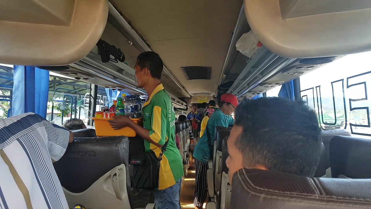 우리는 이 버스를 장장 5시간 정도 탔는데 그 안에서 재미있는 광경을 많이 목격했다. 첫째는 중간에 탑승하신 할머니. 자리가 없어 남편과 나 사이에 앉으셨고, 현지어를 사용하셔서 전혀 통하지 않았지만 열심히 손짓을 통해 이야기를 나누었다. 둘째는 갑자기 시작된 버스의 시장화였다. 페리에 버스가 실리기를 기다리는데 어디서 나타난 건지 열 명이 넘는 장사꾼들이 버스에 막 올라타 음식과 물건을 팔았다. 과일부터 선글라스까지 없는 게 없었다. 그리고 또 언제 사라진 것인지 알 수 없을 만큼 빠르게 버스를 빠져나갔다. 정말 대단한 광경이었다.