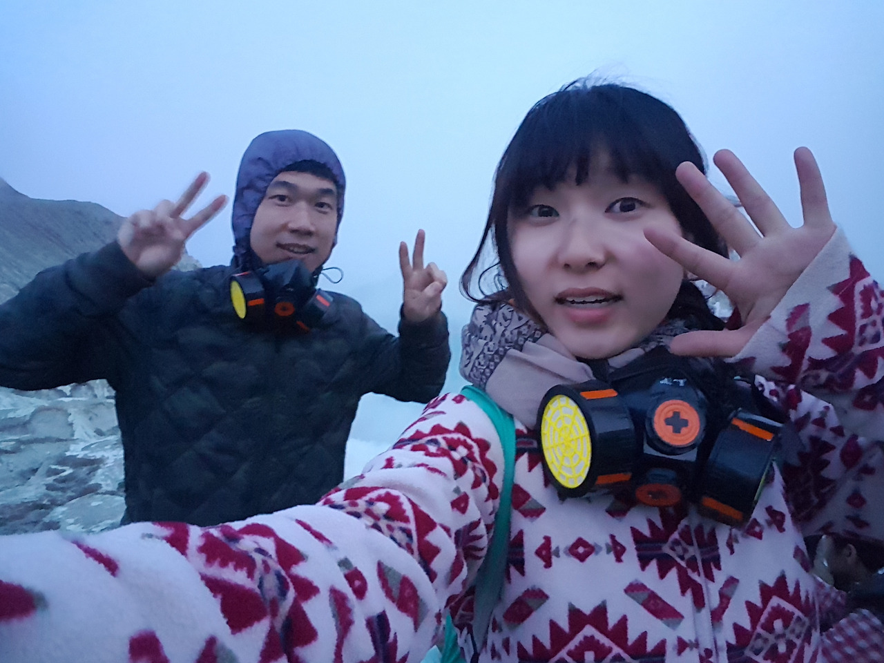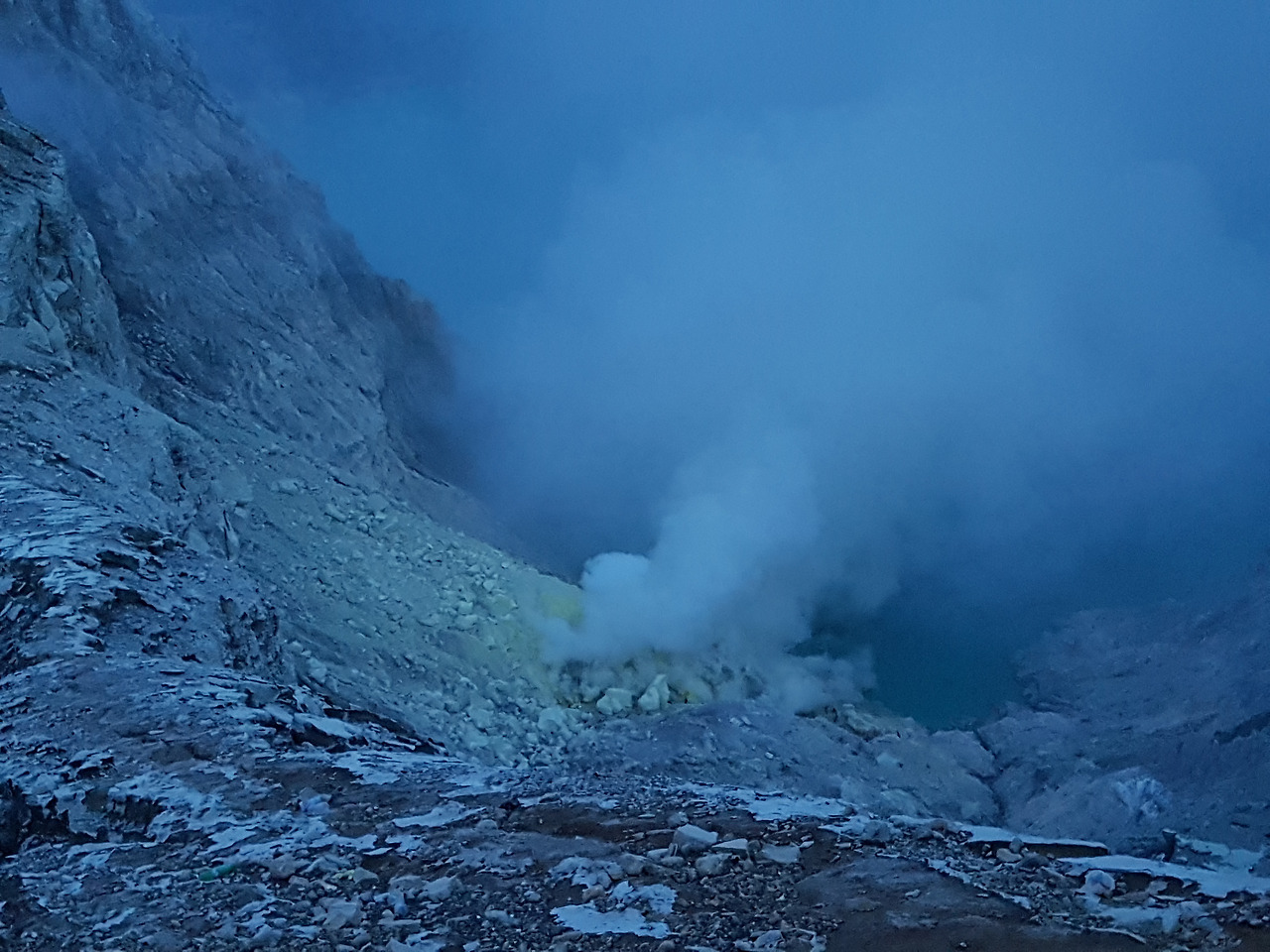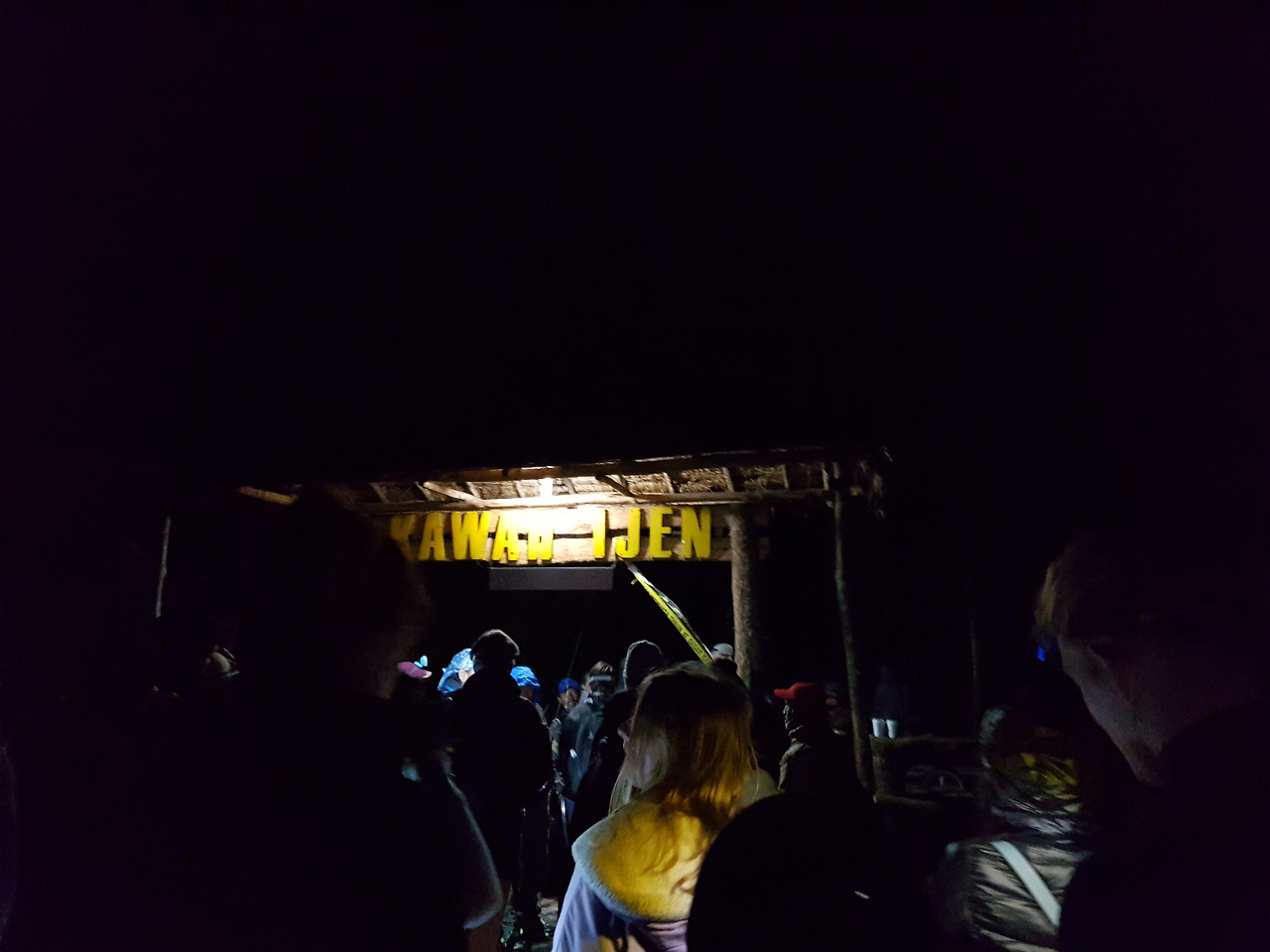 나도 초반에 너무 빠르게 올라갔는지 다리가 아파오기 시작했다. 남편은 내 상태를 보고 늦어도 괜찮으니 천천히 올라가자고 했다. 그렇게 한 시간 반 정도 묵묵히 올라가다 보니 어둠 속에서 흐릿한 웅장함이 모습을 드러냈다. 빛이 없어 그 형체를 정확히 알 수는 없었지만 책에서나 보던 화산 분지 테두리쯤에 내가 서 있는 것 같았다. 그리고 한 300m를 더 가니 그곳에 사람들이 모여 무언가를 보고 있었다. 나도 사람들 틈에 끼어 허술한 나무 난간 아래로 까마득한 어둠을 내려다보았다. 저 멀리서 푸르스름한 불길이 간헐적으로 나타났다 사라지기를 반복했다. 블루 파이어! 니가 바로 그 블루 파이어구나!