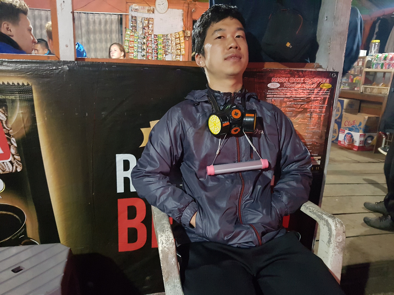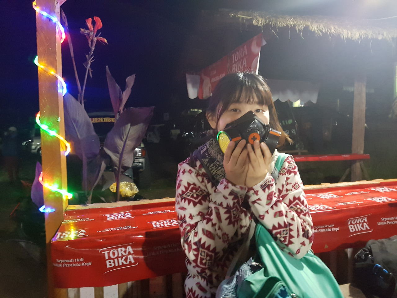 잠시 뒤 굉음을 내며 짚차가 멈춰 섰다. 안에는 다른 여행자 둘이 먼저 탑승해 있었고, 우린 수줍게 인사를 나눈 뒤 맨 뒷좌석에 자리를 잡았다. 동네를 벗어나 산길에 접어들자 짚차는 내달리다 못해 우당탕탕 굴러 올라갔다가 와장창창 굴러 내려갔다. 그동안 내 엉덩이는 방방에 맛 들인 아줌마처럼 주책없이 점프를 계속했다. 그렇게 한 시간을 정신없이 가다 보니, 베이스캠프 같은 곳이 나타났다. 작은 매점과 화장실 그리고 게스트 하우스를 가장한 텐트촌등으로 구성된 그곳에서 우리는 1시간 반 정도를 대기해야 했다. 그동안 전 세계 각지에서 이젠 화산을 보러 150명 정도 되는 사람들이 하나 둘 모여들기 시작했다. 전날 저녁을 제대로 먹지 못해 너무나 배가 고팠던 나는 매점에서 딸기 크림빵 하나를 사 먹고, 남편은 걸쭉한 자바 커피 한 잔을 마셨다. 그리고 가이드가 나누어 준 방독면이 독한 유황 가스를 잘 막아주기를 바라며 열심히 테스트해두었다.