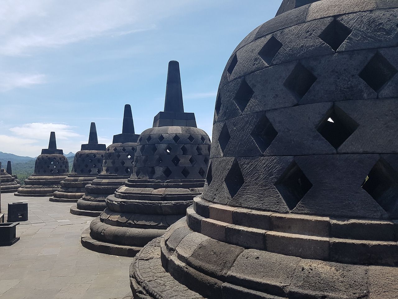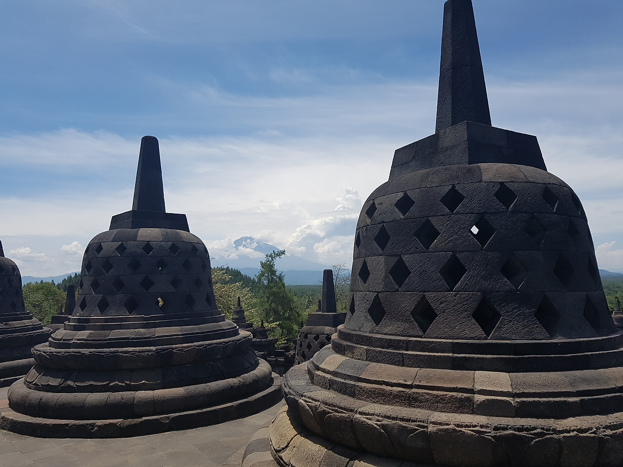 고요하게 잠들어 있는 듯한 스투파들 사이로 머라삐 화산이 웅장한 자태를 뽐낸다. 그 옛날 사람들 눈에는 화산 폭발이 자연의 분노로 보였을 것이다. 때문에 그 결과물인 화산암으로 거대한 사원을 지어 믿음의 대상을 감히 덤빌 수 없는 두렵고 강한 존재로 만들어 나간 것은 아닐까 하는 생각이 들었다. 어찌 되었든 생천 처음 불교라는 종교에 얽힌 이야기들을 들춰보았고, 나름 새로운 경험이었다. 하루 종일 함께 다닌 가이드 아주머니의 설명이 아니었으면 재미없는 하루가 될 뻔했다.