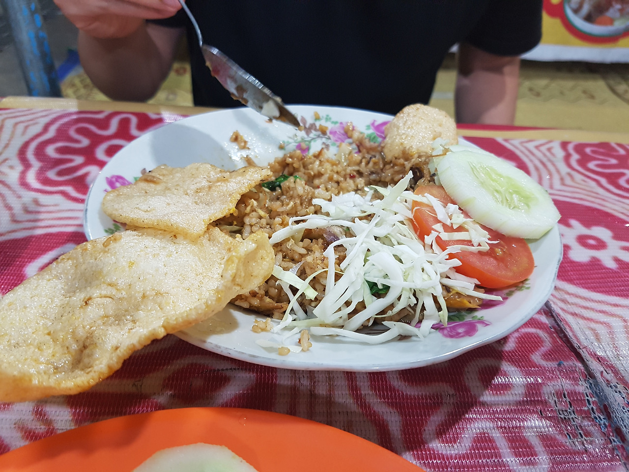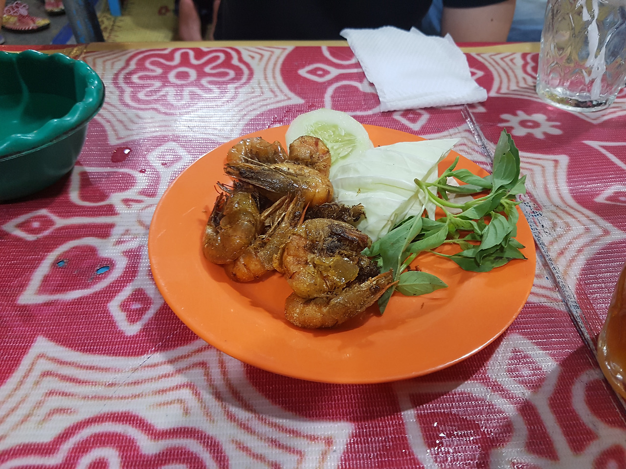 여행자 거리 한쪽에 길게 늘어져있는 포장마차 행렬은 우리에게 너무나 익숙한 분위기였다. 우리는 어디가 맛있을까 기웃대다가 잘 모르겠어서 그냥 사람이 많이 앉아 있는 곳으로 들어갔다. 남편은 스페셜 나시고랭, 나는 튀긴 새우를 시켰다. 먼저 나온 새우는 너무나 짜서 밥이 없으면 먹기 힘들었다. 하지만 맛은 좋았다. 다음으로 나온 스페셜 나시고랭! 기존 나시고랭과는 조금 다르게 매콤한 맛이 일품이었다. 기분 탓이었을지 모르지만 전에 먹었던 것보다 훨씬 맛있게 느껴졌다.