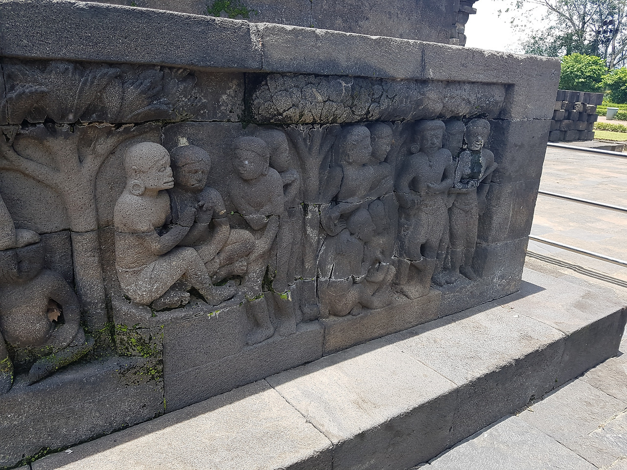 사원으로 들어 서기 전, 한쪽에 마련되어 있는 역사관 같은 곳에 들어가 간단한 설명을 들었다. 7세기까지 족자카르타가 있는 자바섬은 인도에서 이동해온 왕조들이 다스렸다. 이들이 만든 사일랜드라 왕조가 평지도 아닌 높은 동산 위에 어마어마한 보로부두르 사원을 건설한 것이고 이를 위해 매일 1천 명의 사람들이 화산에서 돌을 캐다 날라야 했다. 하지만 한 때 동남아시아 불교의 중심지 역할을 했던 이 보로부두르 사원은 무엇 때문인지 12세기경 버려지게 되고, 이후 화산이 폭발하며 그 재에 묻혀 정말 아무도 모르는 역사의 흔적이 돼버린다. 그러던 어느 날 영국인 한 명이 우연히 이곳을 발견하게 되고, 다시금 세상에 알려져 복원이 시작되었다. 그런데 초반 복원 당시 주변 정글을 정리하고 그대로 개방 해버려서, 주변 마을 사람들이 돌을 가져다 자기 집 보수하는데 쓰거나, 불상 머리를 떼다가 외국인들한테 팔거나 말도 안 되는 일들이 많이 벌어졌다고 한다. 그래서 보다 못한 유네스코에서 1973년, 27개국의 협조를 받아 본격 복원 사업에 착수하여 현재의 모습을 갖추게 된 것이다. 때문에 504개의 불상 중 300개 이상이 머리가 없는 상태였다. 참 안타까운 일이다.