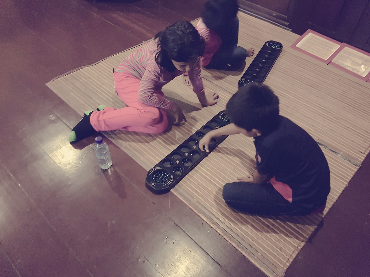 말라카 시내가 온통 내려다 보이는 언덕 위 교회에서 천천히 내려와 술탄 박물관으로 들어갔다. 특이하게 맨발 입장이다. 삐걱거리는 나무 마루를 밟으며 과거 말라카의 역사를 둘러보았다. 박물관 한 켠에는 시청각 자료가 방영되는 TV와 전통 놀이를 즐길 수 있는 공간이 마련되어 있었다. 아이들의 놀이 모습을 자세히 보니 그릇에 있는 구슬을 집어 한 칸에 하나씩 놓으며 이동하는 게 기본 규칙 같아 보였다. 놀이의 이름은 '총칵'. 집중하며 노는 아이들의 모습이 귀여웠다.