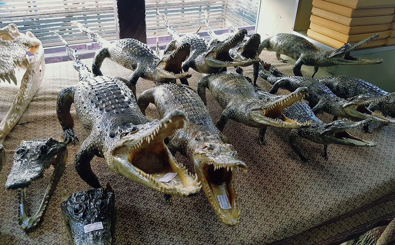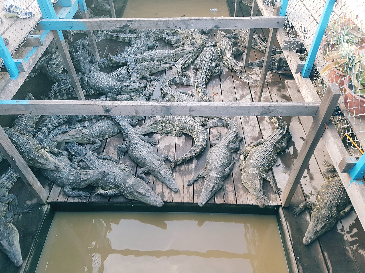 우리가 탄 배는 커다란 수상 가게 앞에 멈춰 섰다. 가게 1층에는 악어 우리가 있었다. 악어가 정말 우글우글했다. 수상생활을 하는 사람들은 주로 어업에 종사하거나, 일부는 이렇게 가게를 운영하는데 거의 대부분의 사람들이 가옥 안에 악어를 기른다고 했다. 고기와 가죽을 팔면 비교적 높은 수익을 얻을 수 있기 때문이라고. 아니나 다를까 가게 안으로 들어가니 죽은 새끼 악어들이 박제되어 있었다. 살아 있을 때보다 유독 생동감 있는 포즈로 진열대에 올려진 악어들에게서 알 수 없는 쓸쓸함을 느꼈다. 살아있을 때는 좁은 공간에서 움직임이라고는 전혀 없는 생을 살다가, 마지막 순간 입을 쫙 벌린 채 사(死)를 장식해야 하니 말이다. 참 우리의 인생 못지않게 악어의 인생 또한 아이러니하다는 생각을 하며 계단을 따라 전망대로 올라갔다. 많은 사람들이 먼저 와 사진도 찍고 강 풍경도 감상하고 있었다. 우리도 선교사님과 함께 기념으로 셀카 한 장을 남겼다. 어휴, 더워서 그런가 얼굴이 많이 커졌네.