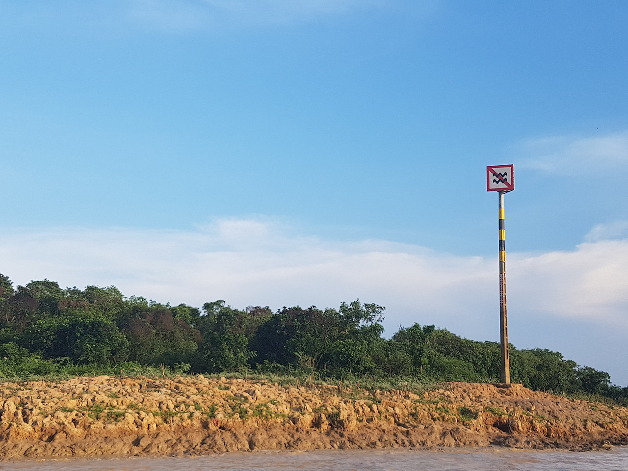 한참을 가니 옆으로 맹그로브 숲이 보였다. 정글에 가까운 숲은 바닥이 물로 채워져 있어 풍부한 어자원을 제공해준다고 한다. 숲을 지나 강을 따라 쭉 가다 보니 표지판 하나가 나타났다. 물결 모양에 금지 표시가 더해져 있다. 무슨 뜻일까 곰곰이 살펴보던 중, 우리 옆으로 배 한 척이 빠르게 지나갔다. 그 순간 강의 너울이 파도로 변신해 우리 배를 크게 흔들었다. 아, 이거였구나. 파도 만들기 금지. 탁해서 속을 알 수 없는 강에 빠지면 어떻게 살아남아야 하나를 고민하는데 저 멀리서 사람이 강속에서 걷고 있었다. 읭?ㅋㅋ. 건기여서 수면이 많이 낮아졌다고 듣긴 했어도 저 정도일 줄은 생각도 못했다. 내가 배를 타고 가고 있다는 사실이 웃겼다. 그래도 빠져도 죽지는 않겠구나 싶어 안심이 됐다.