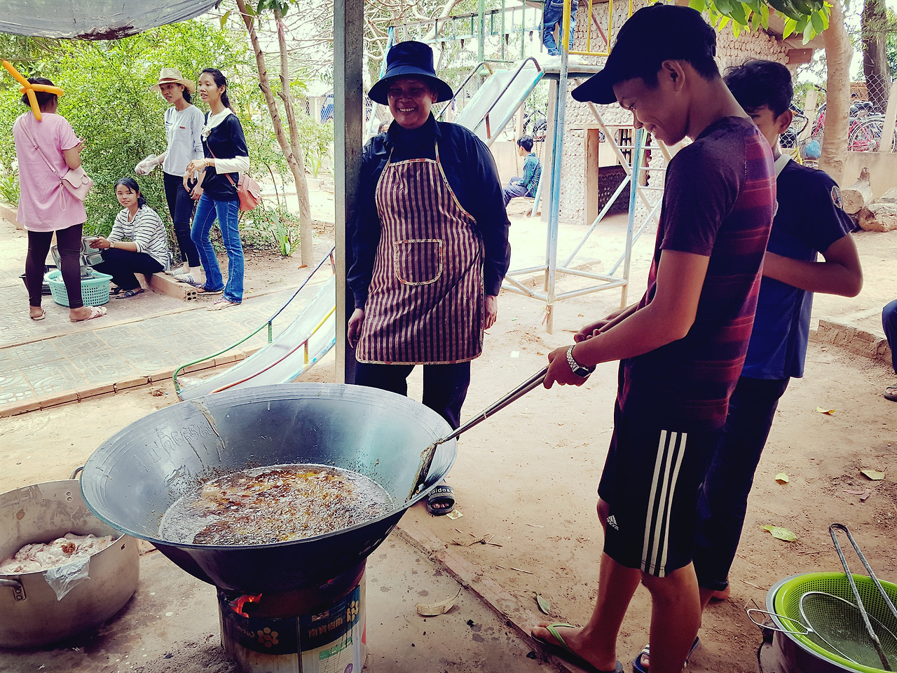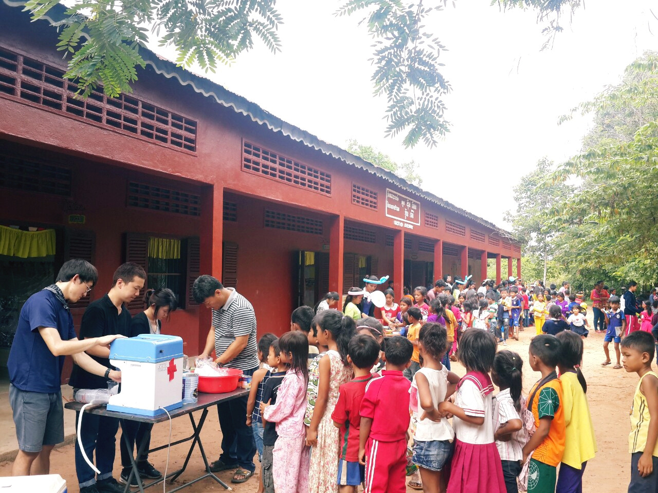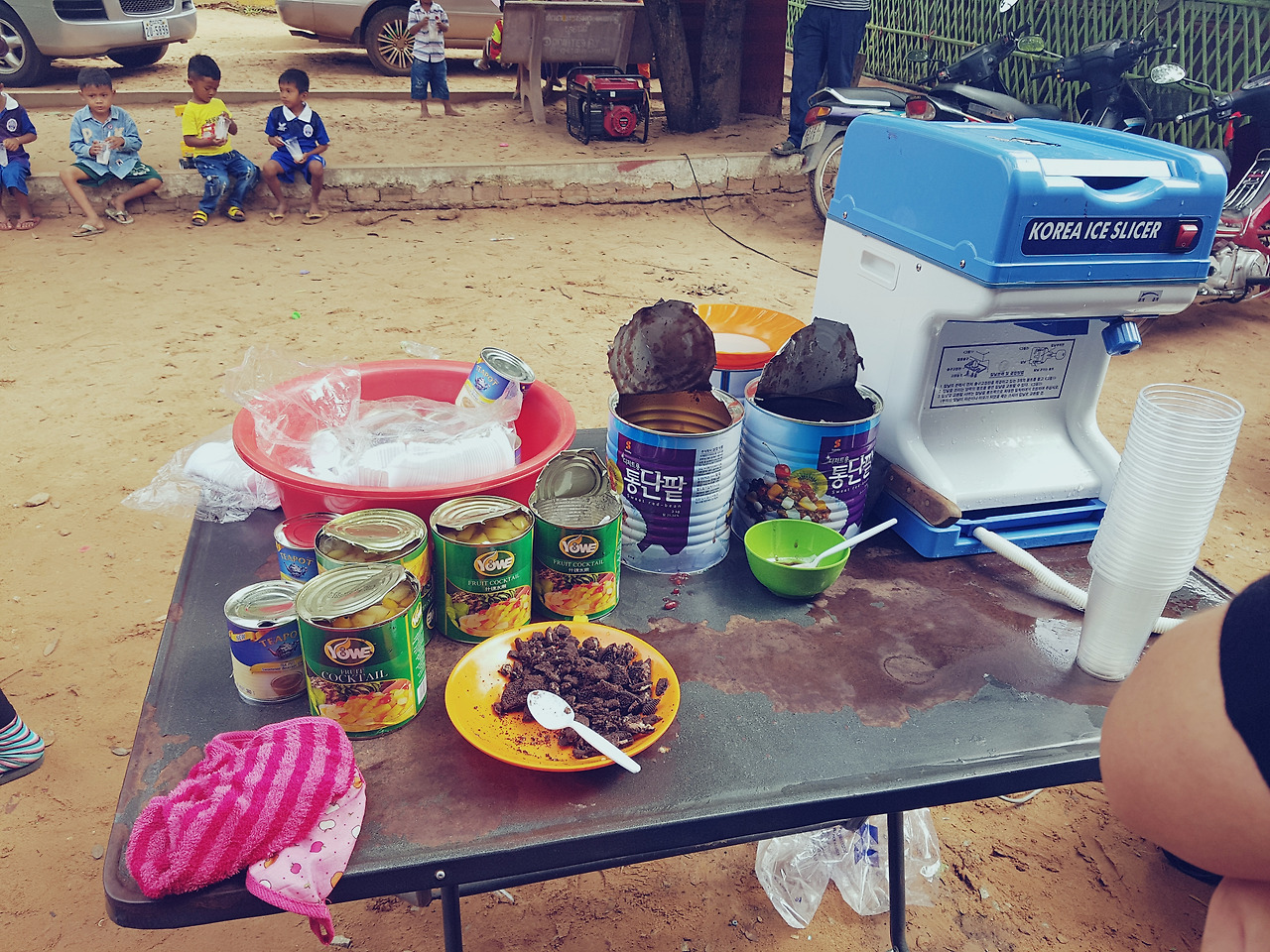 아침 일찍 선교사님의 차를 타고 학교로 향했다. 오늘은 바로 그 달란트 시장이 열리는 날! 학교 운동장에 도착하니 이미 300명 정도 되어 보이는 아이들이 모여 있었다. 모두가 판매할 상품들을 진열하느라 바쁜 가운데 우리는 팥빙수 코너를 배정받았다. '시작'하면 꼬마 손님들이 러시아워처럼 모여들 것이기 때문에, 최대한 효율적인 동선으로 팥, 통조림 과일, 연유를 배치하며 만반의 준비를 바쳤다. 1년 장기 봉사자로 와있는 은찬 씨와 남편이 얼음을 갈아주면 그 위에 고명을 얹어 숟가락을 꽂아 아이들에게 주는 것이 나의 몫이었다. 우리는 시작 전 같이 셀카를 찍으며 여유를 부렸다. 하지만 잠시 뒤 그 여유는 각얼음과 함께 시원하게 갈려 사라지게 된다. 아듀.