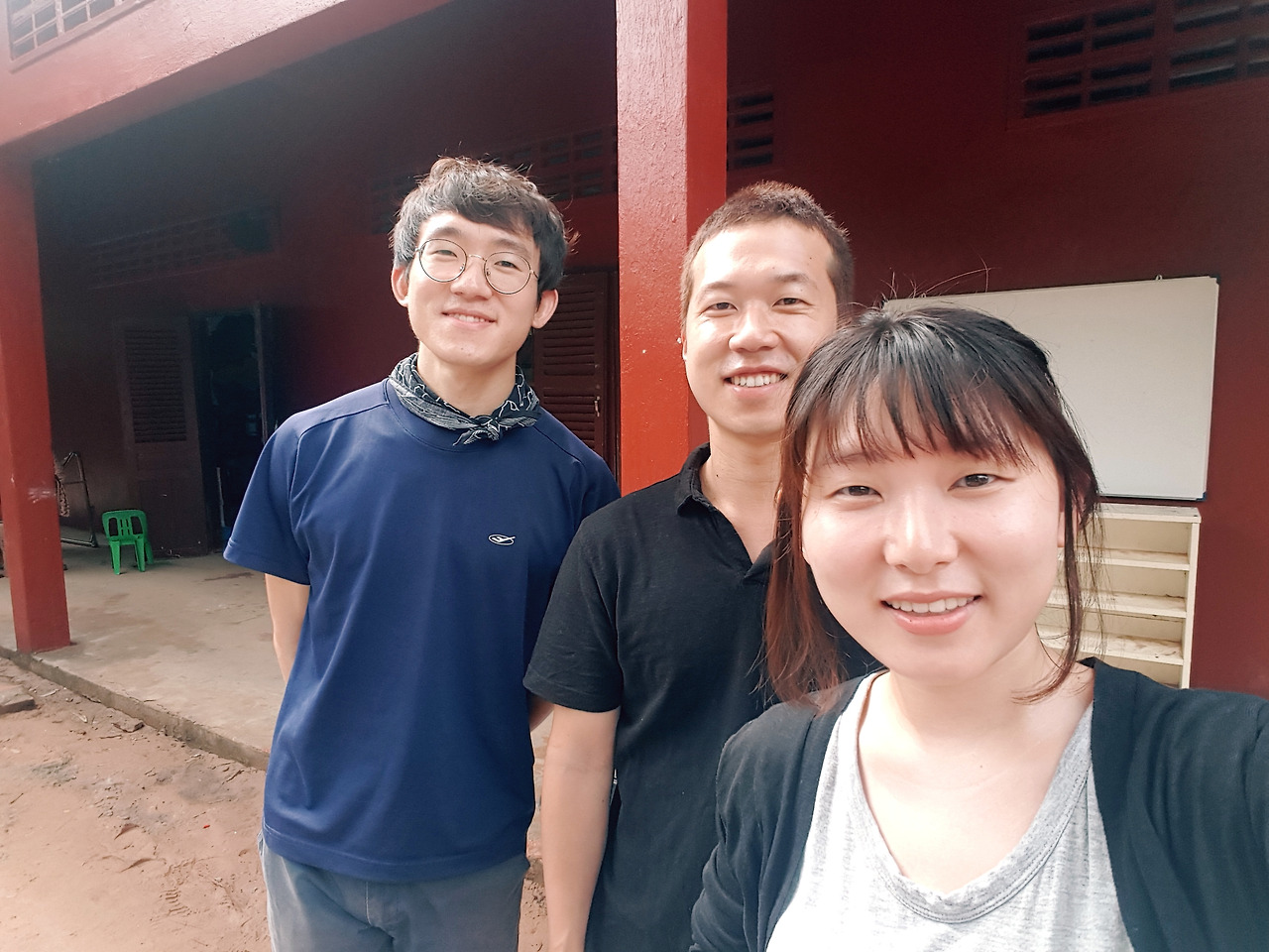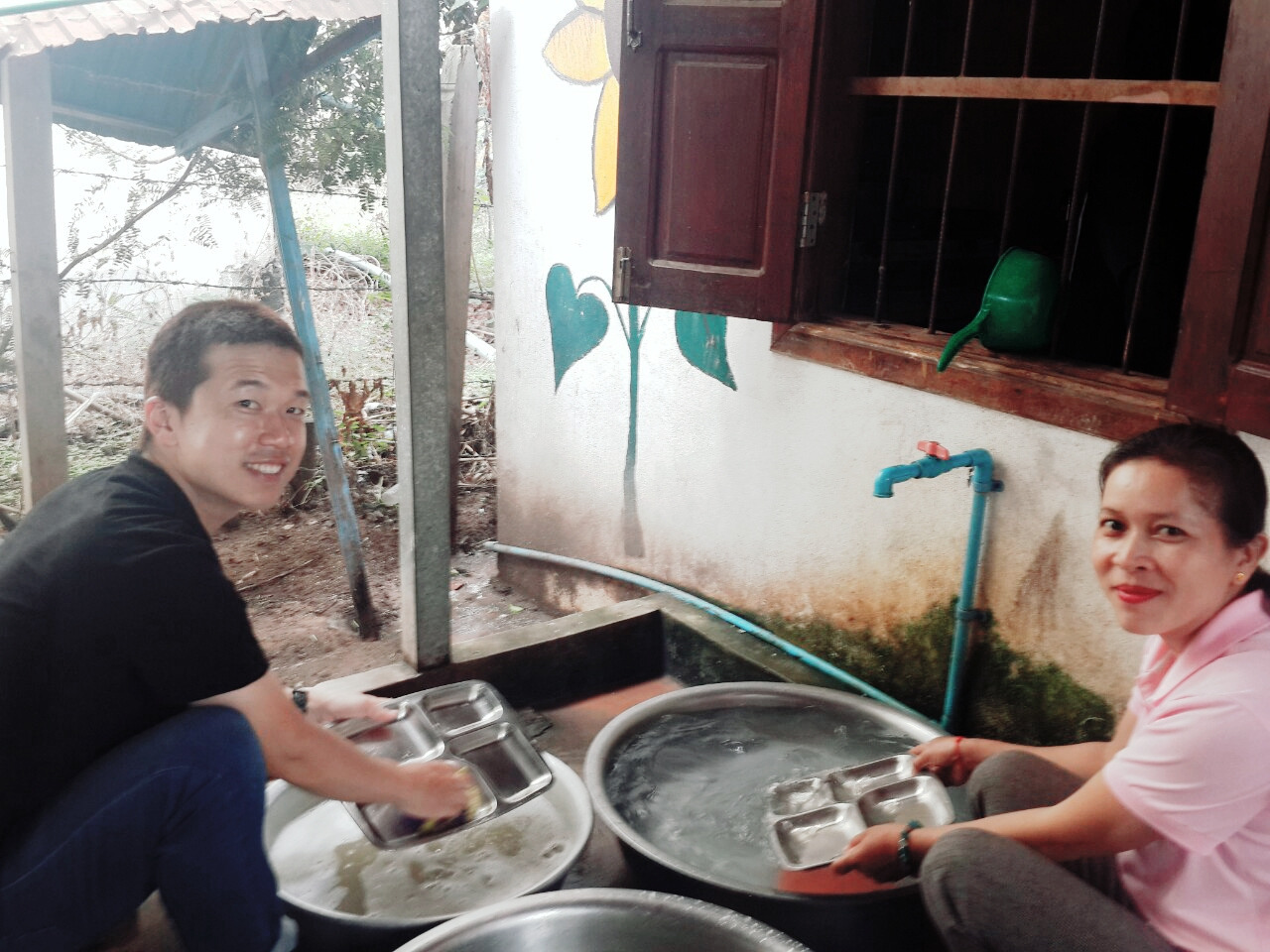 내가 손 빠른 선생님들과 함께 급식 나누기를 할 동안 남편은 교장 선생님과 설거지를 시작했다. 사진 찍기를 좋아하신다는 교장 선생님. 역시 어떻게 찍혀야 예쁜 지도 잘 알고 계시는 듯하다. 아이들이 하나 둘 식사를 마치고 집으로 돌아가니 드디어 우리에게도 식사 시간이 찾아왔다. 봉사자들과 선생님들이 한데 어우러져 밥을 먹었는데, 반찬으로는 잡채와 닭볶음탕과 김치 그리고 아까 튀긴 치킨 등을 주셨다. 진짜 진심 진정 맛있었다. 한 그릇을 깨끗이 비운 뒤 리치로 만든 음료 한 캔도 다 마셨다.