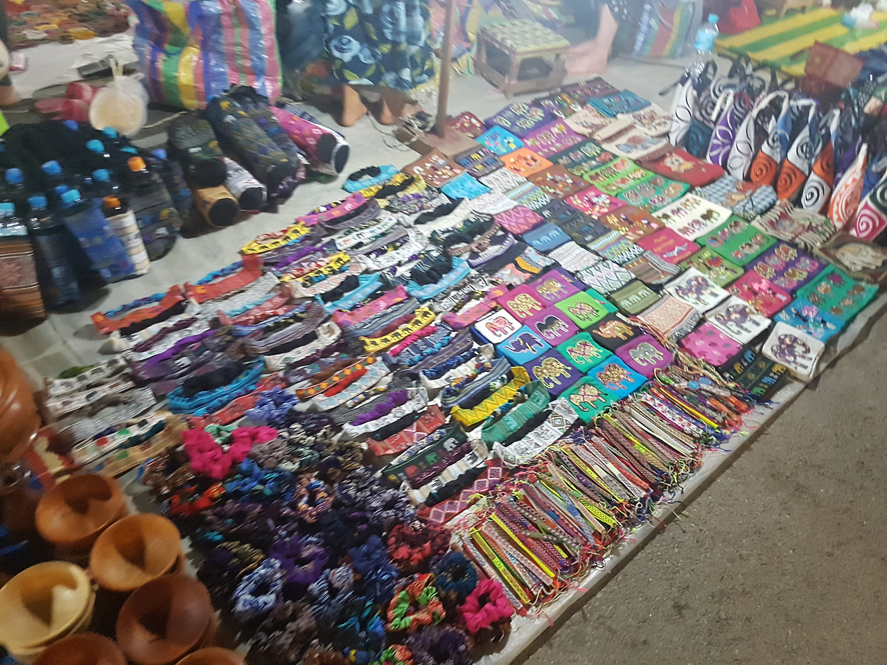 시원한 폭포 놀이를 마치고 숙소로 돌아가 한숨 푹 잔 뒤, 루앙프라방의 명물 나이트 마켓을 구경하러 나갔다. 거리는 고요했던 낮과 달리 활기가 넘쳤다. 그리고 무엇보다 지금까지의 마켓들 중 가장 볼 것도 사고 싶은 것도 많았다. 물론 가격도 매우 매우 저렴했다. 게다가 흥정까지 할 수 있기 때문에 쇼핑의 재미는 배가 되었다. 이런 곳에서 그냥 구경만 하기는 아쉬워 나도 남편 바지 한 벌과 핸드폰 담을 작은 가방 하나를 샀다. 흥정 끝에 가방은 1만낍(약1,400원), 바지는 2만낍(약2,800원)에 구매했다. 싸게 사서 좋아했는데, 남편의 바지는 나중에 엄청난 물 빠짐으로 새로운 국면을 맞이하게 된다ㅋ