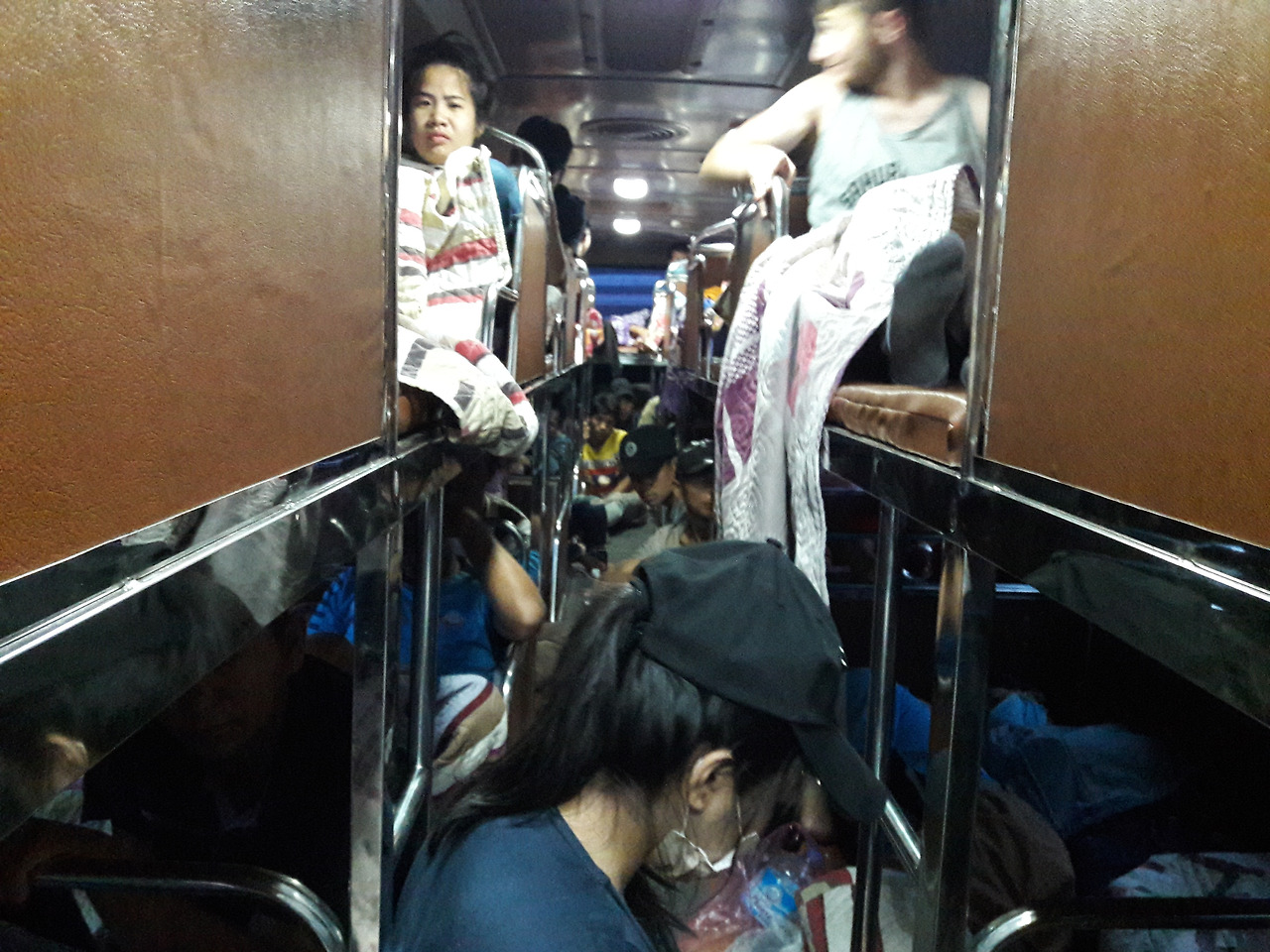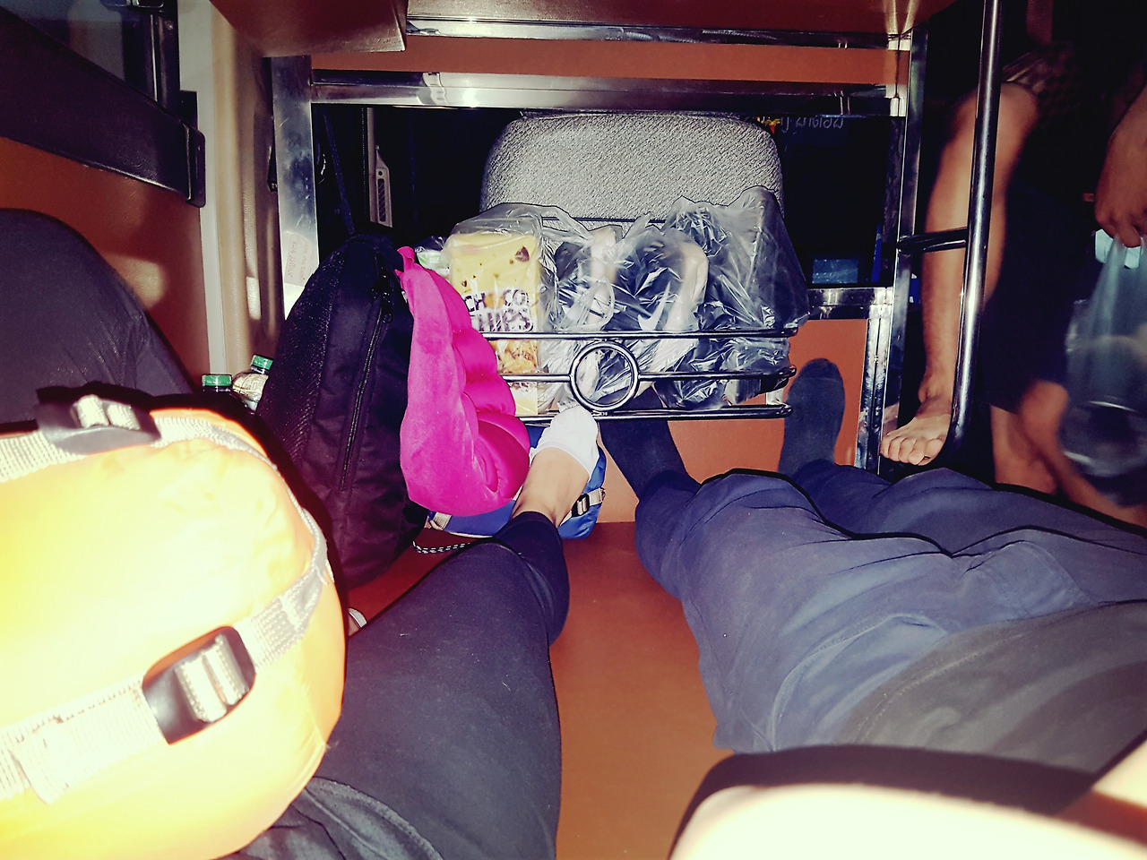 우리가 배정받은 차는 공교롭게도 참 좋은 방송 EBS. 한국에서 중고 차량을 사 와서 이렇게 이용하는 경우가 많다고 들었는데, 우리가 그 차를 타게 될 줄은 몰랐다. 이때까지만 해도 재미있는 상황에 웃어가며 탑승을 했다. 하지만 겉만 멀쩡한 이 차량은 정확히 5시간 뒤 지옥의 도가니탕으로 변신하게 된다. 모든 좌석은 2층 침대 형태로 되어 있는데, 두 명이 한층을 사용하게 되어 있다. 우린 아래층을 배정받았는데 그나마 단신이기에 다리를 쭉 펼 수 있다는 것에 감사했다. 그런데 자세히 보니 바퀴 위에 위치한 자리라 천장이 터무니없이 낮았다. 그래서 12시간 동안 앉지도 못하고 통조림 속 고등어처럼 누워있어야만 했다.