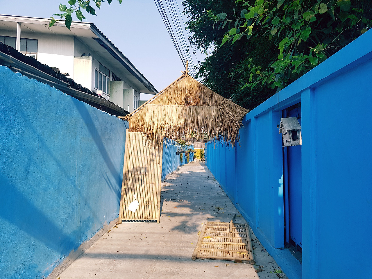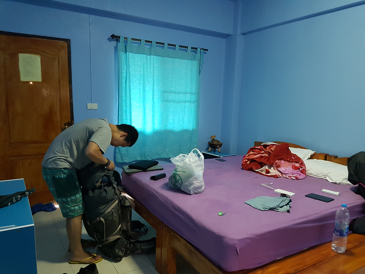 그렇게 만난 우리의 치앙마이 숙소. 들어가는 입구가 파랑파랑한 것이 너무 예뻤다. 방에는 따로 테라스가 딸려있어 옷을 빨아 널기 좋았고, 빵빵한 에어컨과 넓은 침대도 완벽했다. 하지만 우리의 컨디션은 아주 꽝이었다. 우선 어젯밤 속을 비운 뒤 제대로 된 식사를 하지 못했기 때문에, 기운이 하나도 없었다. 뭐든 먹어야 했기에 짐을 풀고 5시쯤 식당을 찾으러 나왔다. 그런데 축제 여파로 대부분의 가게들이 문을 닫은 상태였고 설상가상으로 장대 같은 비까지 내리기 시작했다. 우리는 문 닫은 식당 앞에 서서 비가 잦아들기를 기다렸다. 그리고 여기저기 헤매다 숙소 근처 구멍가게에 들어가 컵라면 2개와 물을 샀다. 맛있는 밥 먹기를 고대했지만 우리는 좋아하지도 않는 똠양꿍 맛의 라면을 먹어야 했다. 그리고 먹다 남은 과자들로 배고픔을 달래다 잠을 청했다.