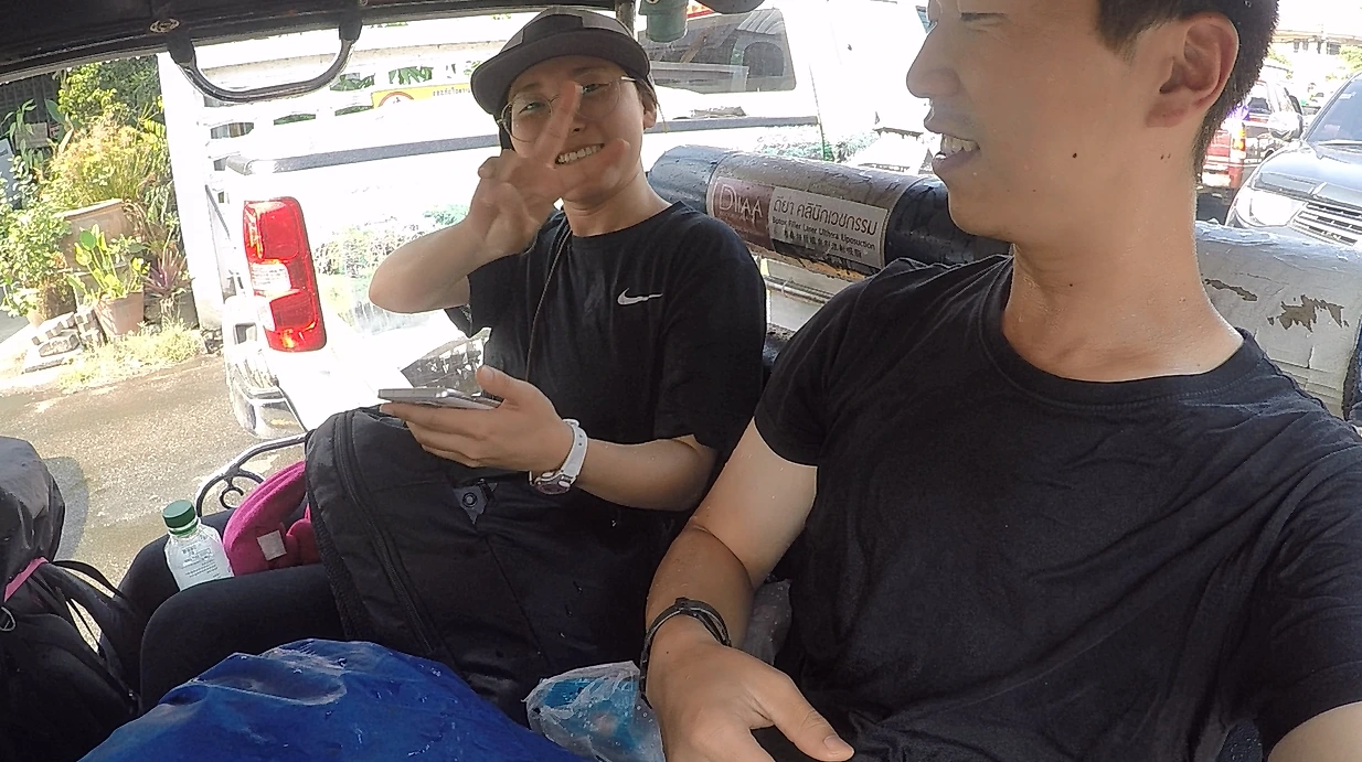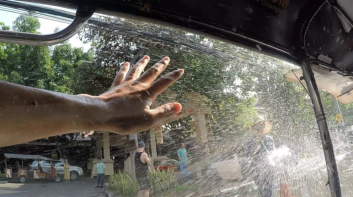 치앙마이 버스 터미널에서 숙소까지 가는 데는 툭툭을 이용했다. 처음 기사님과 흥정을 하는데, 다들 너무 높은 가격을 불렀다. 이유인즉슨 송크란 축제의 시작 날이라 번화가 쪽을 지나가면 물을 흠뻑 맞게 된다는 것이다. 그렇다. 일부러 물을 맞기 위해 툭툭을 탄다는 그 축제가 이미 시작되어 있었던 것이다. 그래도 그 가격에는 탈 수 없었기에, 주변을 돌아다니며 기사님 물색에 나섰다. 터미널 반대쪽으로 걸어가니 툭툭들이 주차되어 있었다. 다가가니 기사님이 '툭툭?'이라고 먼저 말을 걸어오셨다. 그래서 지도에서 숙소 위치를 보여 드리고 얼마에 갈 수 있는지는 여쭤보았다. 앞선 다른 기사님들보다 훨씬 저렴한 150밧(약 4,700원)에 합의를 보고 툭툭에 올라탔다. 한 5분을 달렸을까, 주변 사람들이 슬슬 물총으로 물을 찍하고 뿌리기 시작한다. 그러다 한눈을 판 사이 지나가던 차에 탄 사람이 바가지로 물을 촥하고 끼얹졌다. 나는 무방비로 물 싸대기를 맞고 빵 터져서 웃고 말았다. 남편도 예외는 없었다. 우리는 어떤 무기도 없이 그렇게 20분 동안 시원하게 물을 맞으며 숙소에 도착했다.