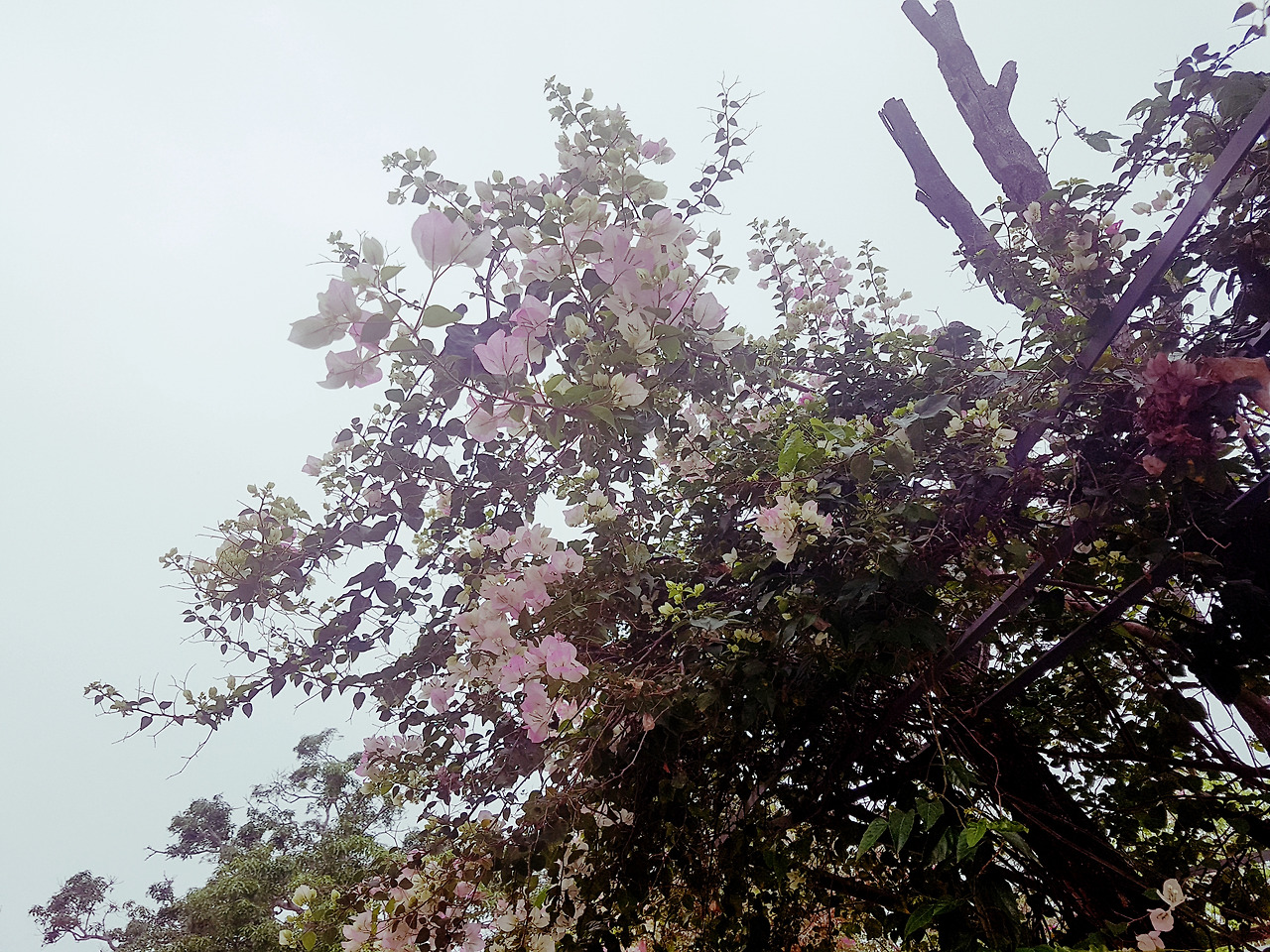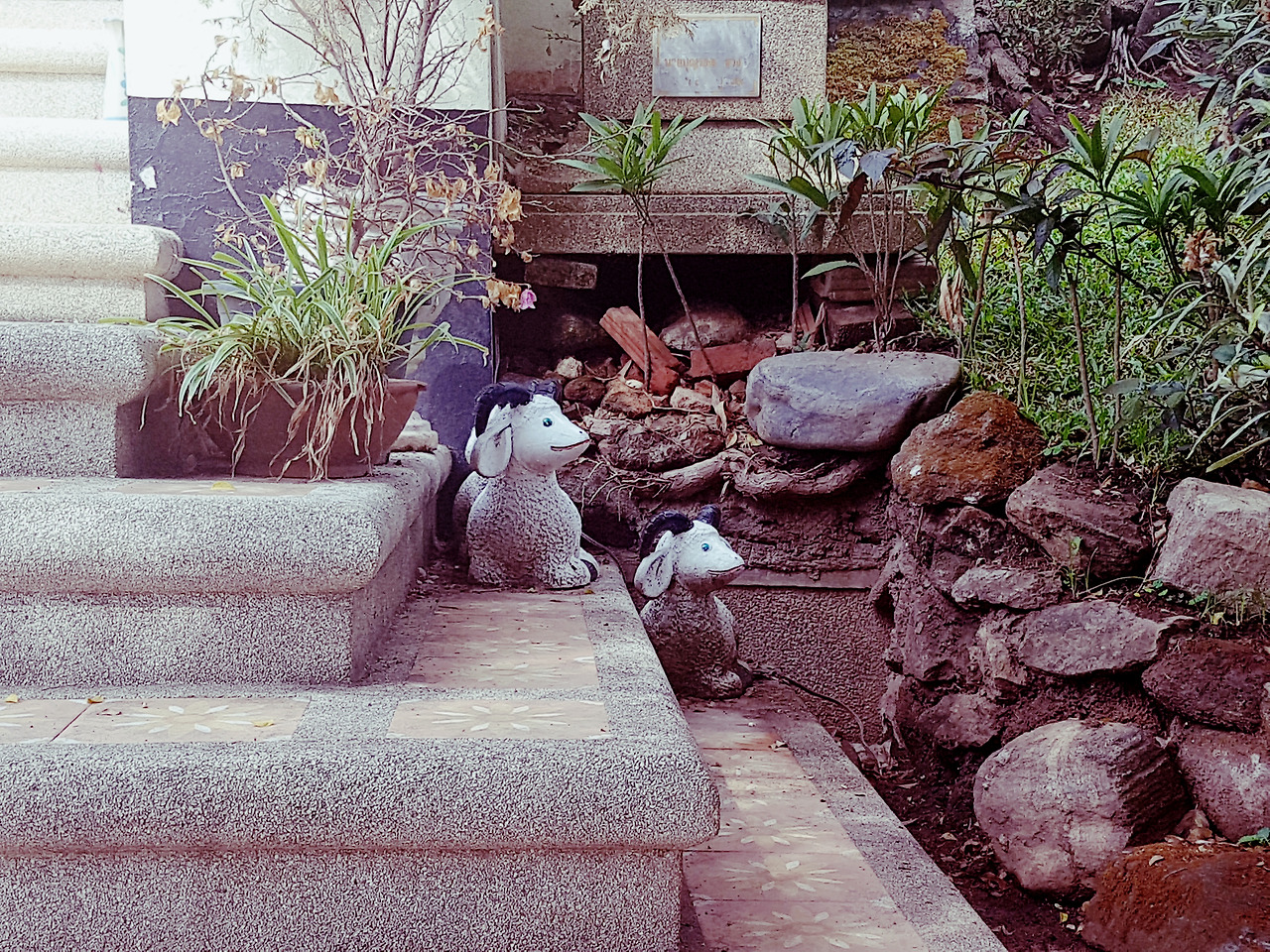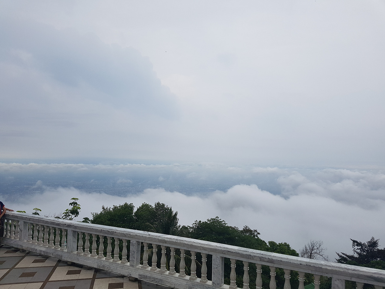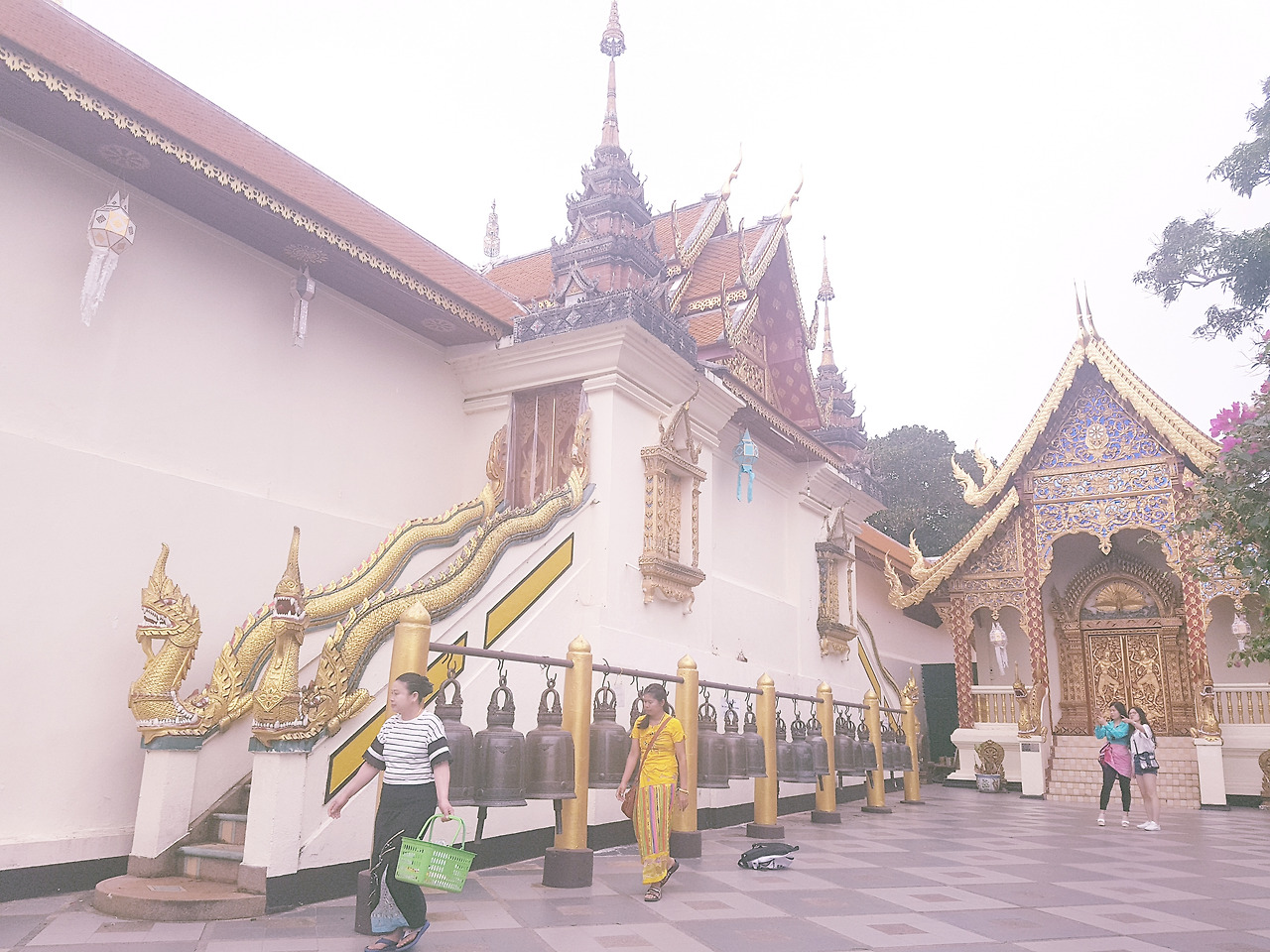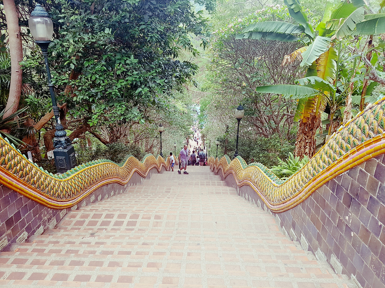 여행사 직원이 어떻게 우리를 구워삶았든 선택은 스스로 한 것이니 화를 낼 수도 없었다. 그렇게 사원에 가는 길은 우중충하게 비까지 왔다. 도이수텝은 높은 언덕 위에 지어져 치앙마이 시가지를 한눈에 내려다보기 위해 가는 사원인데 비구름이 자욱해 아무것도 보이지 않았다. 짜증 게이지가 절반을 넘어서는 듯한 기분이었다. 급격히 말수가 줄어든 남편과 나는 떨떠름하게 사원을 구경하기 시작했다. 사원 자체는 부분 부분 타일 모자이크 양식을 사용하고 있어 매우 아름다웠다. 사람들이 소원을 빌고 한 번씩 치는 종소리도 은은했다. 사원 뜰 곳곳에 놓인 조각상들과 꽃나무들은 강렬한 컬러감의 사원과 어우러져 화려함을 더해주었다. 그리고 그 사이를 거니는 우리는 여전히 말이 없었다. 후.