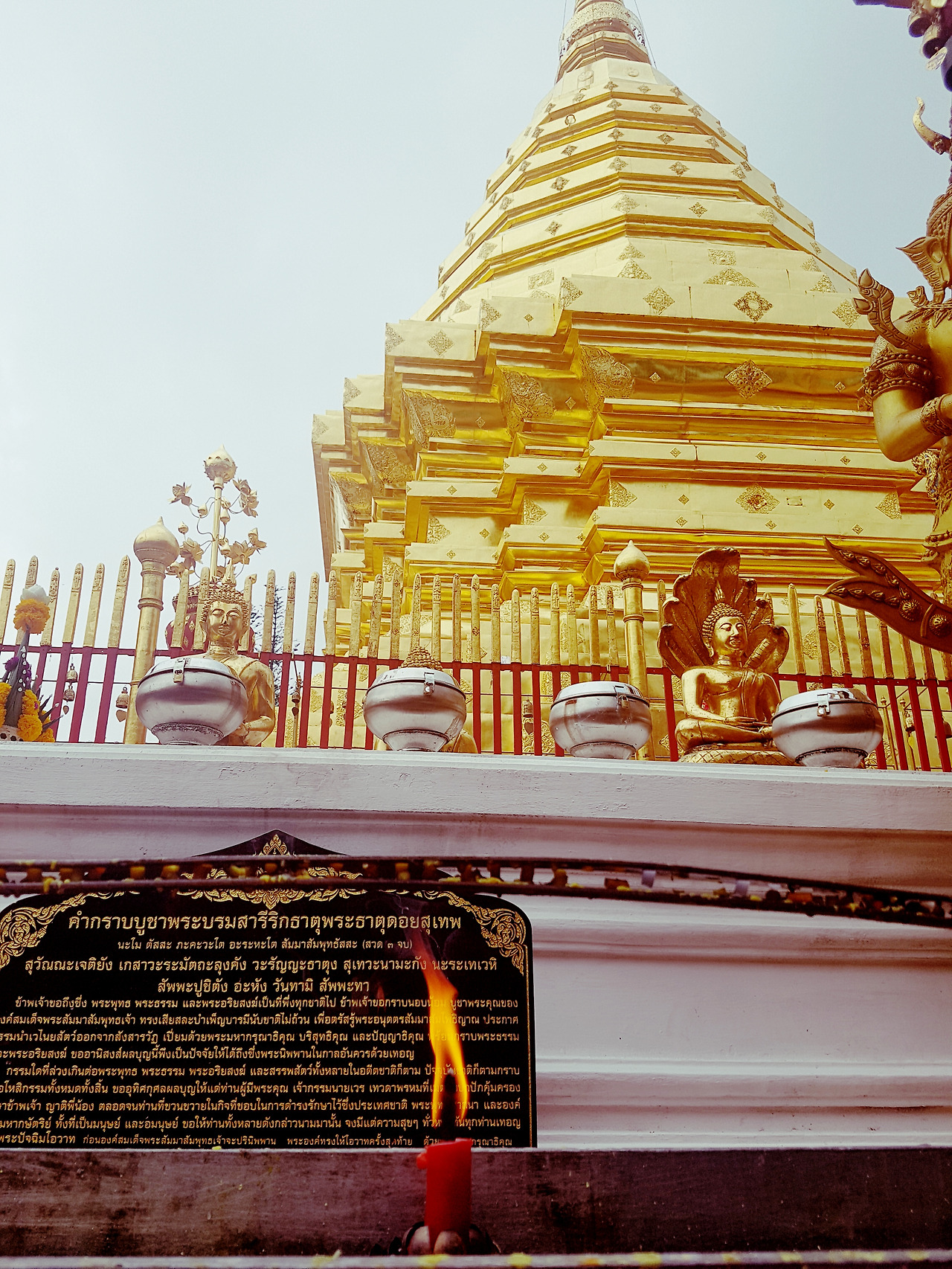 사원의 또 다른 구경 포인트는 황금으로 만들어진 중앙 탑이다. 이곳은 맨발로 들어가야 하기에 신발을 벗고 천천히 계단을 올랐다. 온통 금색으로 찬란한 탑 주변에는 작은 양초와 꽃을 놓고 소원을 비는 많은 불교 신자들이 있었다. 사람은 늘 자신이 믿는 종교의 대상에게 무언가를 빈다. 기독교도 돈과 건강과 행복을 달라고 기도하는 '기복주의 신앙'으로 가득 찬 지 오래다. 하지만 내가 아는 하나님은 빈다고 그런 것을 주시는 분이 아니다. 절대로. 그분이 바라는 것은 오직 그분을 닮는 것. 그리고 각자에게 주어진 삶이 끝나면 그때 함께 천국을 누리는 것이다. 모든 것이 혼란스러울 때는 기본으로 돌아가는 것이 맞다고 생각한다. 그리고 지금이 바로 그런 때라고 확신한다.