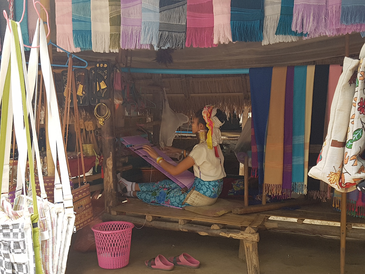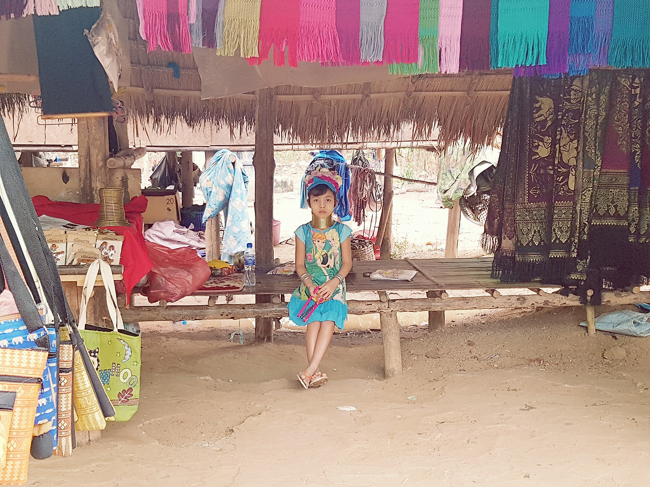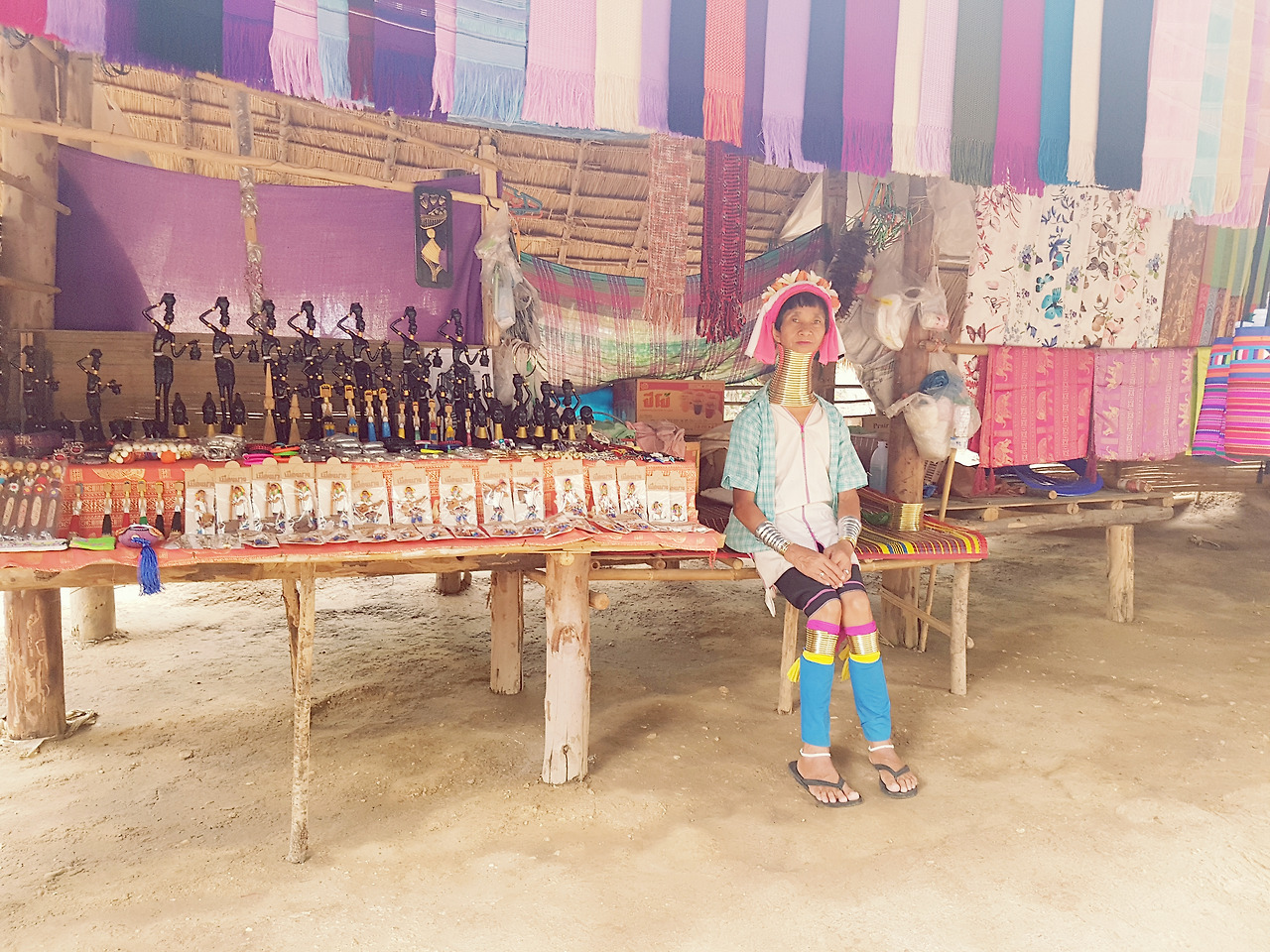 카렌족은 원래 미얀마에 살던 사람들인데 미얀마 독립 당시 정부에 자치령 설립을 요구하다가 갈등이 생겨 이곳 태국 북부지방까지 밀려오게 되었다고 한다. 농사 외 수입이 거의 없고 그것마저 여의치 않아 여인들이 천을 짜거나 손자수로 만든 기념품들을 팔아 살아가고 있다고. 우리가 갔을 때에도 양 옆으로 길게 이어진 기념품 가게 안에서 목에 링을 착용한 여성들이 천을 짜고 있었다. 일곱 여덟 살 정도 되는 여자 아이들도 눈에 띄었다. 그녀들이 이렇게 긴 목으로 살아가는 데에는 여러 가지 설이 있다. 첫 번째는 야생 동물로부터 목을 보호하기 위함이었다는 설과 두 번째 목이 길수록 아름다움의 상징이라는 설, 그리고 셋 번째 전쟁 중 여자들을 잡아가지 못하게 하려고 목을 길게 늘여 흉측한 모습으로 만들었다는 설이다. 내가 알고 있던 내용은 두 번째 설인데, 세 번째가 맞다는 사람이 많은 것 같다. 모든 카렌족이 이렇게 링을 착용하는 것은 아니고 '뻐다웅족'만 이런 풍습이 있으며, 현재는 건강상 거의 하지 않는 추세라고 한다.