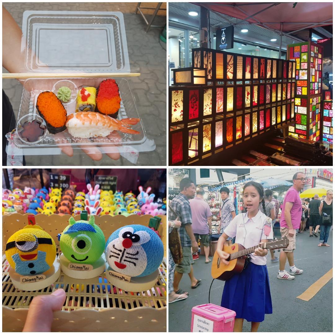 한숨 푹 자고 일어나니 안 좋았던 기억이 어제 일처럼 멀게 느껴졌다. 역시 여러 가지 의미에서 잠이 보약이다. 가뿐해진 몸과 마음으로 저녁도 먹고 구경도 할 겸 타페 게이트 앞 썬데이 마켓을 구경하러 나갔다. 길을 따라 10km 정도 펼쳐진 시장은 볼거리도 먹을거리도 정말 많았다. 우리는 85밧(약 2,800원)을 내고 커다란 치킨 한 조각과 팟타이 한 접시, 쏨땀 한 접시를 시켜 맛있게 먹었다. 그리고 하나에 10밧(330원)짜리 초밥도 사 먹었다. 시장에서 판매하는 물건들은 특이한 게 많았다. 필요한 것들로만 엄선해서 약간의 쇼핑을 즐기다 보니 낮에 있었던 감정들이 눈 녹듯 사라져버렸다. 사람이 이렇게 간사하다. 그러니 웬만하면 다툼에 에너지를 쓰기보다 내가 행복해질 수 있는 다른 일에 집중해야겠다는 생각이 들었다. 바로 태평가의 한 대목처럼!