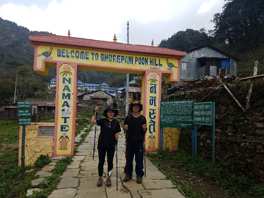체력 소모가 빠르기 때문에 원래는 3시간쯤 걸은 뒤 점심을 먹어주어야 하지만, 우리는 조금 참았다가 목적지에 가서 먹기로 하고 계속 걸었다. 그렇게 1시간가량을 더 걸으니 고레빠니 마을을 알리는 현판이 나타났다. 드디어 오늘의 목적지 도착! 엄청나게 힘이 드는 것은 아니지만, 가볍게만 걷는 길 또한 아니기 때문에 그날 묵을 롯지가 눈 앞에 나타나면 그렇게 기분이 좋을 수가 없다.