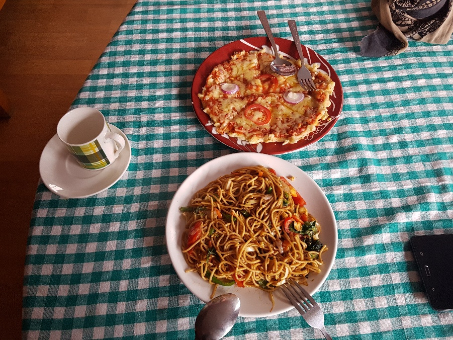 점심으로는 피자와 야채 볶음면을 먹었다. 히말라야는 고도가 높아질수록 롯지의 밥값이 비싸진다. 당연한 일이다. 이곳까지 나귀로 사람으로 무거운 식재료들을 옮겨온 것을 생각하면 말이다. 하지만 밥값이 비싼 대신 양이 어마어마하게 많다. 한국에서처럼 1인 1메뉴를 시키면 꼭 남기고 만다. 하지만 배가 고팠던 우리는 엄청난 양의 밥을 싹싹 해치워버렸다. 그리고 몰려오는 졸음을 이기지 못해 방으로 돌아가 3시간 동안 낮잠을 잤다.