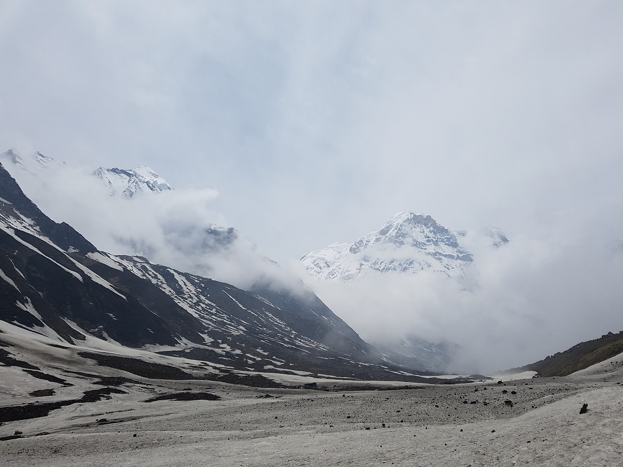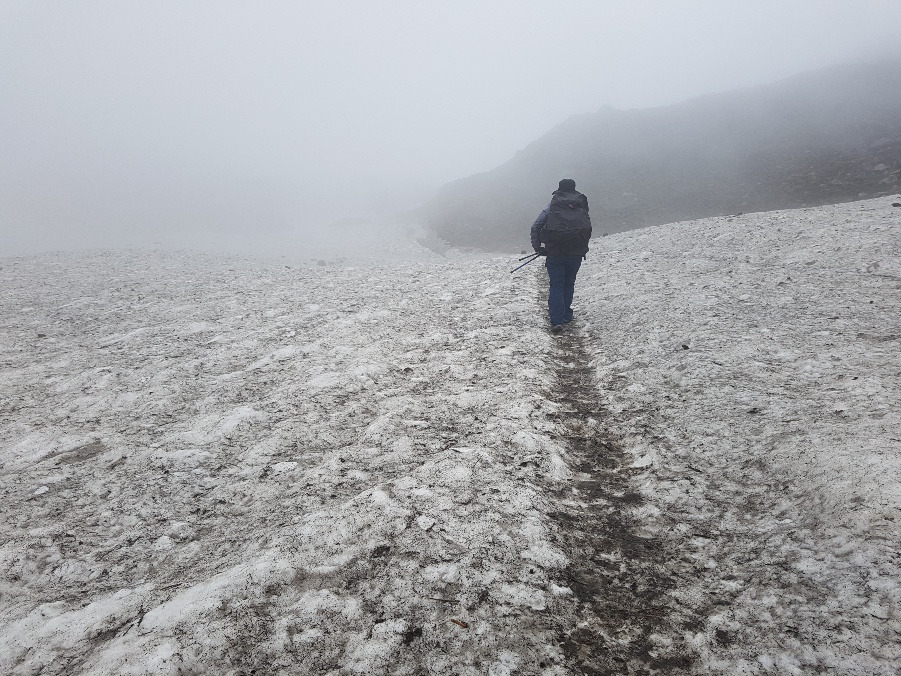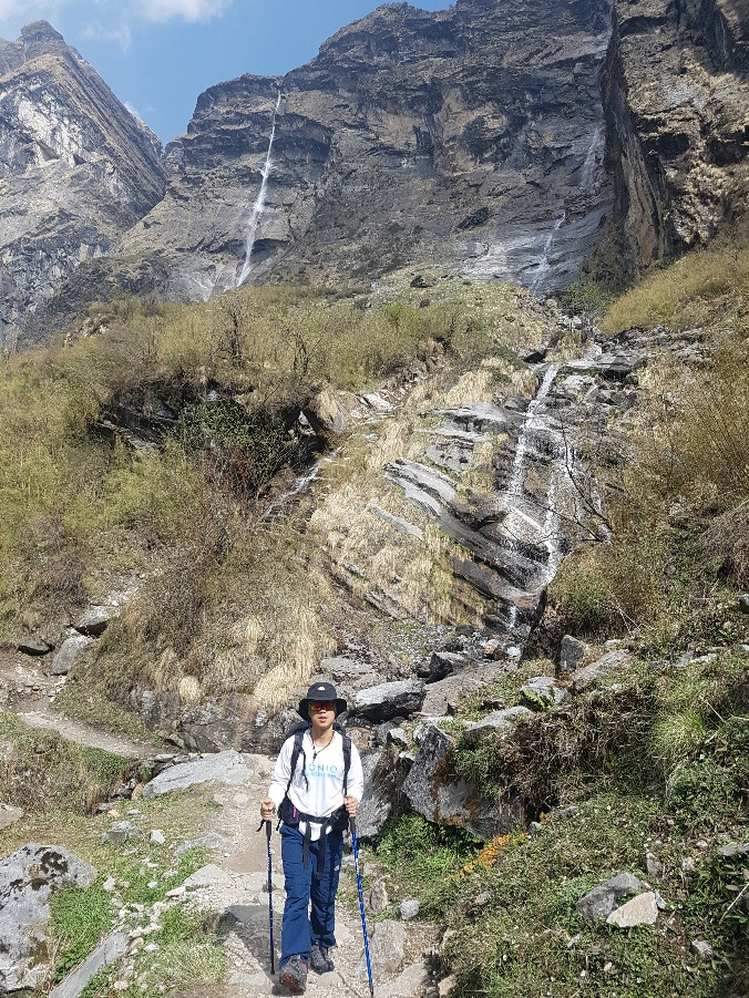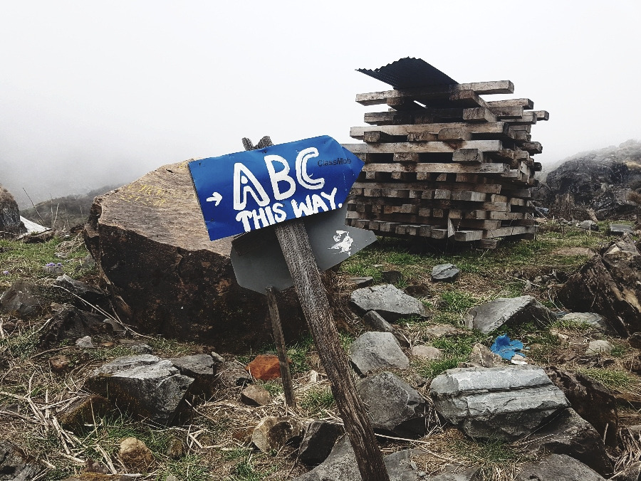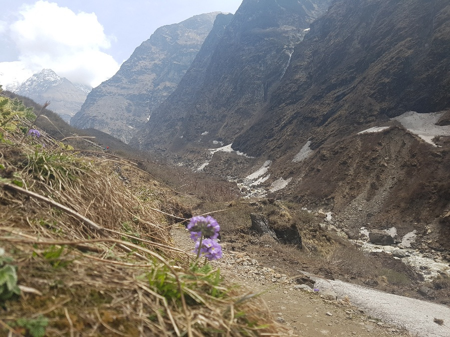ABC로 가는 길은 지난 5일 동안 걸어온 길들보다 훨씬 아름다운 절경을 뽐냈다. 만년설이 녹아 폭포가 되어 떨어졌고, 앞을 한치도 알 수 없는 거대한 구름이 우릴 감쌌다. 발 밑에는 얼음에 가까운 눈밭이 나타났고 그와 중에도 이름을 알 수 없는 보랏빛 꽃이 찬바람에 살랑였다. 베이스캠프가 가까워질수록 처음 보는 낯선 행성에 온 듯한 느낌이 들었다. 기괴하면서도 아름답고 또 척박하면서도 풍요로웠다. 발을 떼어 앞으로 나아가는 것 자체가 아쉬운 그런 날이었다.