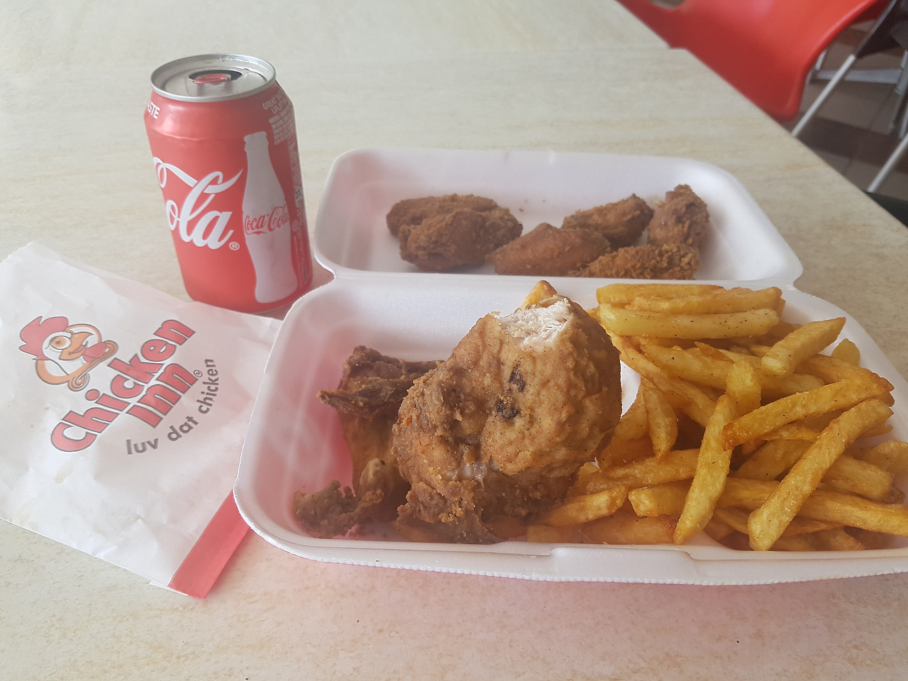 체크인을 하기에 조금 이른 시간이라 짐을 맡겨 두고 밥을 먹기 위해 번화가 쪽으로 향했다. 역시 사람이 많이 다니는 곳이어서 그런지 이런저런 장사꾼들이 여럿 포진해 있다. 여행 상품을 파는 사람, 나무 조각품을 파는 사람, 엄청나게 단위가 커진 과거 짐바브웨 지폐를 파는 사람까지 참 다양하기도 하다. 나도 기념으로 지폐나 한 장 살까 했지만, 가장 큰 100조 달러가 없다고 해서 가볍게 노땡큐를 시전 한 뒤 치킨 가게 안으로 들어갔다.