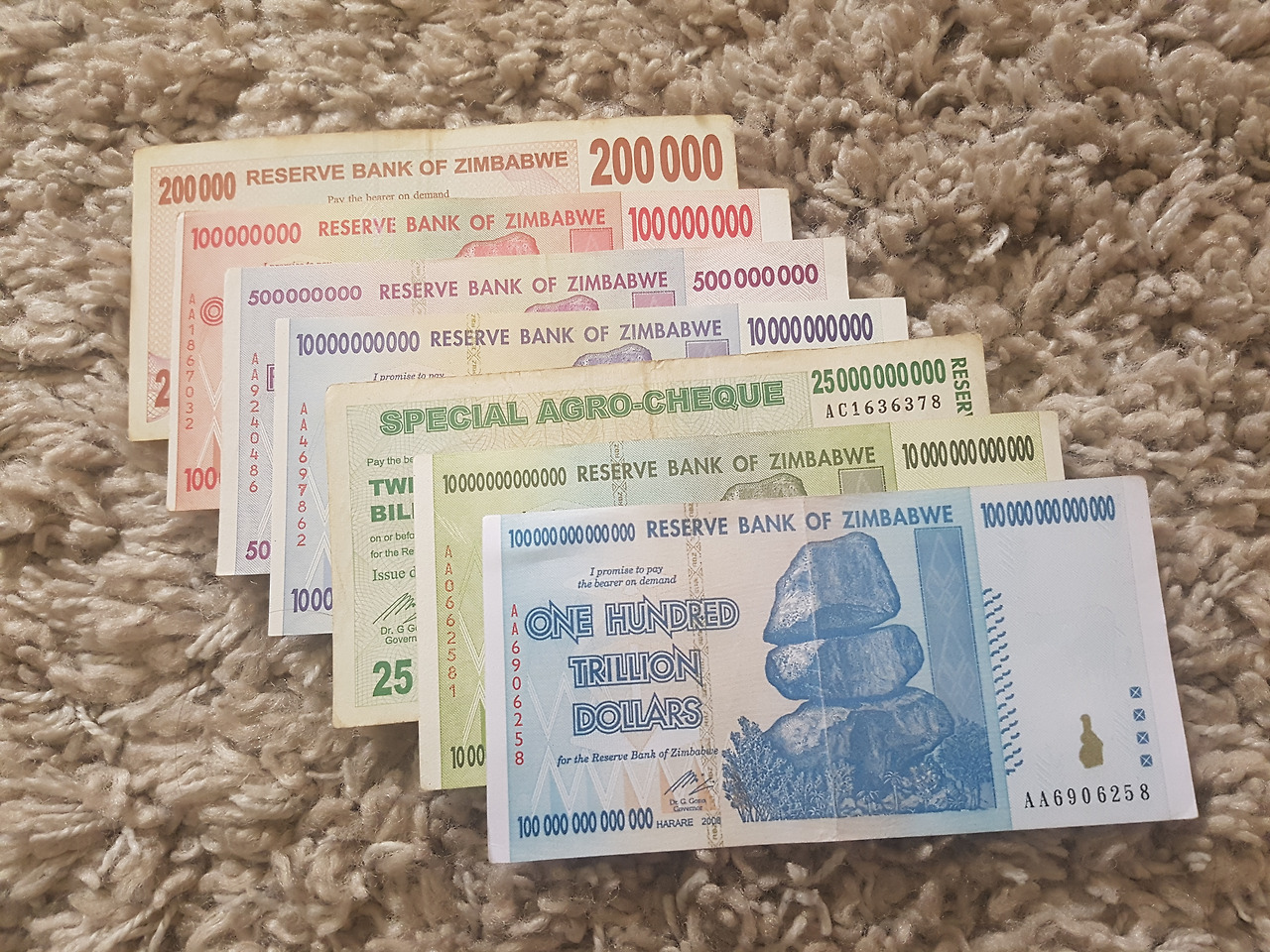 생수와 과자 및 몇 가지 필요한 물건들을 사고 다시 숙소로 돌아가는데 짐바브웨 지폐 장사꾼 하나가 따라붙는다. 자신에게 10조 달러짜리 지폐가 있는데 사라는 것이었다. 우리는 가장 큰 100조 달러짜리 아니면 안 산다고 버텼다. 그러자 그 사람이 주머니에 고이 넣어 두었던 100조 달러 한 장을 꺼내 보여준다. 우리는 돈을 받아 들고 0이 몇 개인지 세기 시작했다. 오, 100조가 맞다. 가격을 물었더니 100조짜리 한 장에 20달러를 달란다. 아무리 희귀 아이템이라도 이건 너무 비싸다 싶어 안 산다고 하니 우리를 붙잡고 자기가 가진 고액권 지폐 7장을 20달러에 다 주겠다고 한다. 살펴보니 20만 달러부터 1억, 5억, 10억, 250억, 10조, 100조까지 다양하게 구성이 되어 있었다. 나름 괜찮은 거래 같아 큰 맘먹고 20달러를 내주고 7장의 지폐를 받아 들었다. 나중에 안 사실이지만 가장 금액이 큰 100조 지폐는 A4 용지에 프린트한 가짜 지폐였다. 만져 보면 종이가 지나치게 빤딱빤딱하고 깨끗한데 당시에는 왜 몰랐을까ㅋ 그래도 나머지는 진짜여서 그나마 다행이다.