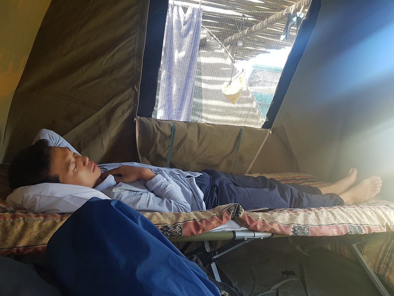 '시어 워터 빌리지'의 리셉션에 가서 '아프리카 트레블 코'의 트럭킹을 신청했다고 말하니 야전 침대가 장착된 텐트 하나를 내준다. 아, 오늘부터 텐트에서 자는 것인 줄은 몰랐는데 이제 정말 시작이구나. 그나마 오늘은 출발 전이라 침대라도 있지만 내일부터는 매트 한 장 깔고 잠을 자야 한다. 겨울이라 저녁에는 꽤나 쌀쌀할 텐데 침낭이 얇아 괜찮을지 모르겠다.