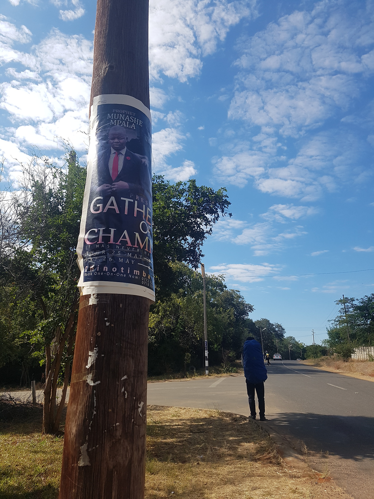 도시에 오자마자 장엄한 빅토리아 폴스를 보러 가고 싶었지만, 우선은 지난밤 급하게 묵은 숙소에서 나와 더 저렴한 곳으로 이사를 해야 했다. 이제 얼추 몸에 익숙해진 각자의 배낭을 메고 어제 방이 없어 퇴짜 맞았던 '맘보 백패커'로 출발. 날씨가 시원해지니 체감상 가방 무게가 절반은 가벼워진 것 같은 기분이 든다. 햇볕은 따듯하고 바람은 시원하고 세상은 마치 방금 물감을 쏟은 듯 노골적인 색채로 여행자의 발길을 붙든다. 나무 전신주에 붙은 찬양 집회 포스터 하나에서도 말도 안 되게 스웩이 느껴지는 여긴 도대체 뭐하는 동네인가.