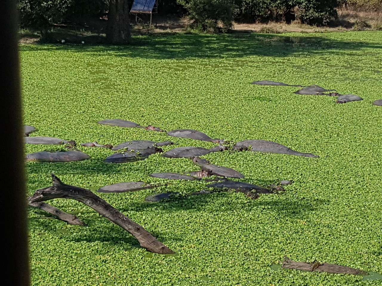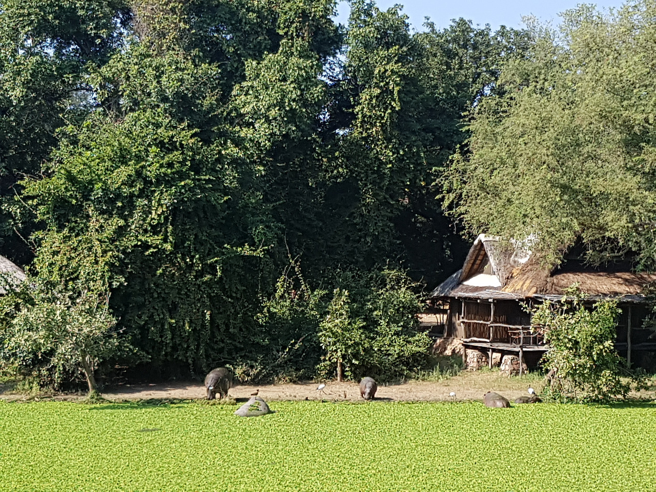 잠비아에서의 마지막 날 아침도 예외 없이 5시 기상. '사우스 루왕와 국립공원 South Luangwa National Park'의 모닝 게임 드라이브에 참여하기 위해 사파리 트럭에 몸을 실었다. 초베국립공원보다 규모는 작았지만 한 무리의 하마 가족이 옹기종기 모여 여유를 즐기는 모습을 가까이에서 볼 수 있었다. 하마들은 초록의 풀들이 가득 떠있는 호수에 몸을 푹 담근 채 가만히 있었는데 수면 위로 살짝 나온 등이 마치 징검다리 같아 보였다. 그래서인지 그 위로 새들이 앉아 쉬었다 가기도 했다.