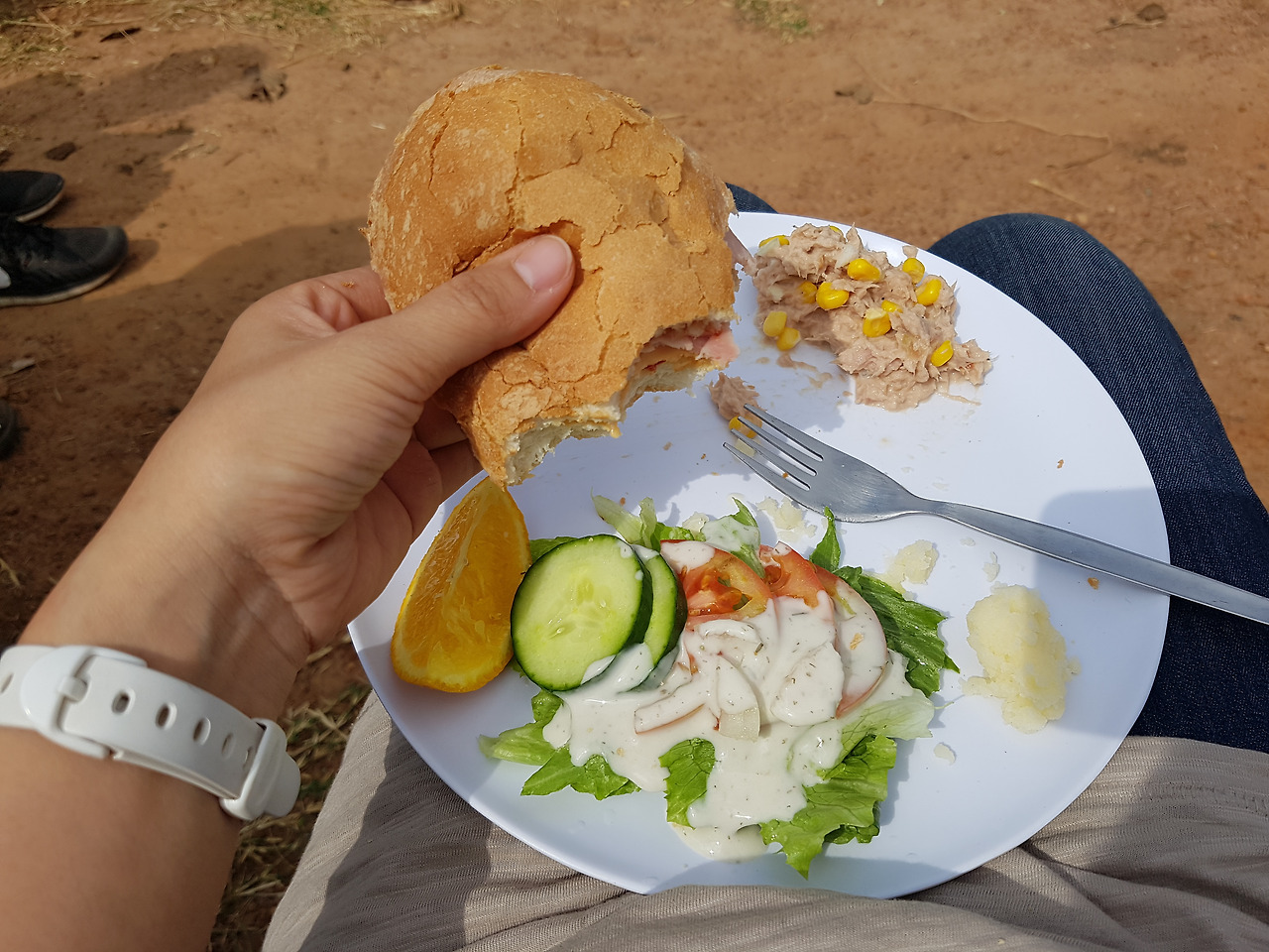 잠비아에서 두 번째 날은 수도인 루사카로 500km 정도를 이동하느라 하루 종일 트럭에서 시간을 보내야 했다. 긴 이동인지라 점심은 한적한 길 가에 차를 세우고 먹게 되었다. 모이가 남자 멤버들과 함께 차에서 긴 테이블 두 개를 꺼내 하나에는 음식을 차리고, 또 다른 하나에는 설거지용 물을 담은 대야를 올린다. 메뉴는 간단하게 입맛대로 만들어 먹을 수 있는 샌드위치다. 빵과 치즈, 햄, 야채, 과일 등을 원하는 소스와 조합한 뒤 둥글게 모여 앉아 식사를 한다. 식사가 끝나면 그릇은 설거지 테이블로 가져가 각자 깨끗이 씻는다.