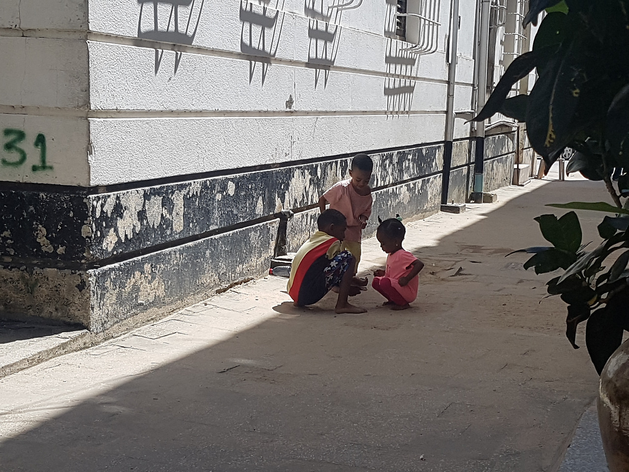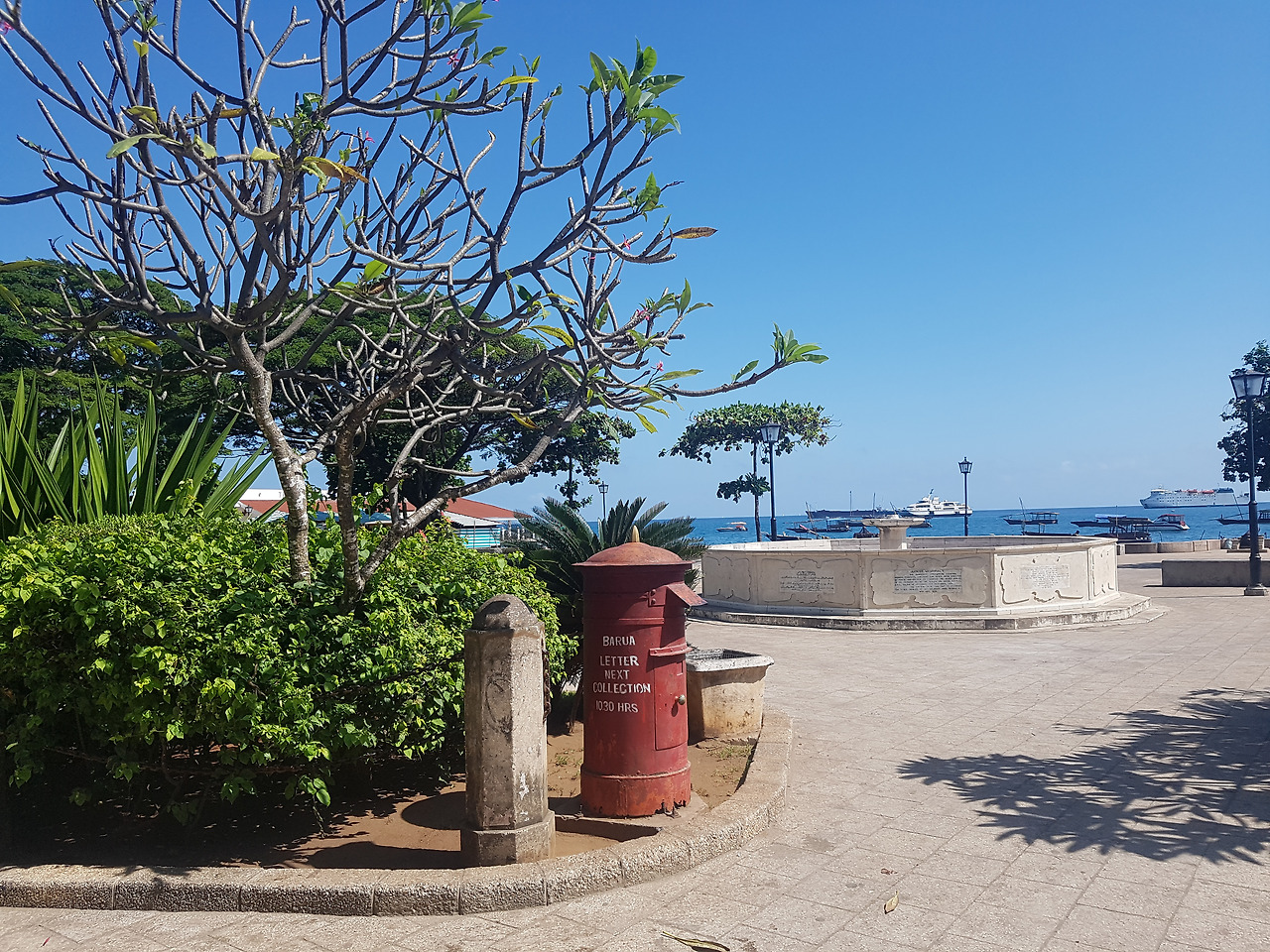 우리는 쪼그리고 앉아 무언가에 열중하고 있는 아이들을 지나 바다가 보이는 공원으로 갔다. 분수대 근처에 놓인 빨간 우체통과 푸른 바다가 참 잘 어울렸다. 성게 덕분에 비록 잔지바르 100% 즐기기에서 1%를 빼야 할 상황이지만 그래도 파란 바다를 보고 있으니 기분이 좋아졌다. 아프리카에 이런 곳이 있으리라고 생각도 못했는데 기대치 않았던 힐링을 받고 가는 것 같다.