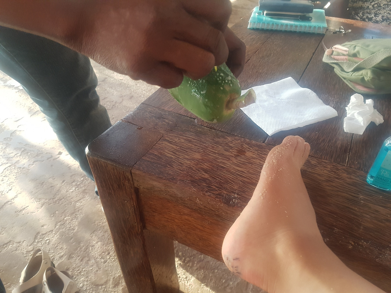 눈물이 날 것 같은 걸 억지로 참으며 남편의 부축을 받아 해변가 소파에 앉았다. 내 모습을 본 베스가 놀라 린다를 찾으러 뛰어갔고, 소파에 앉아 계시던 엘리 할머니와 켈리가 괜찮냐고 난리가 났다. 내가 계속 고통스러워하자 옆 테이블에 앉아있던 네 명의 프랑스 여자들은 자신들이 가지고 있던 손 소독제와 생수를 들고 와 소독을 해주었다. 그리고 가까운 곳에 있던 리조트 직원이 다가와 현지인들이 쓰는 비법이라며 파파야에 구멍을 내 스며 나오는 액체를 상처 부위에 발라주었다.