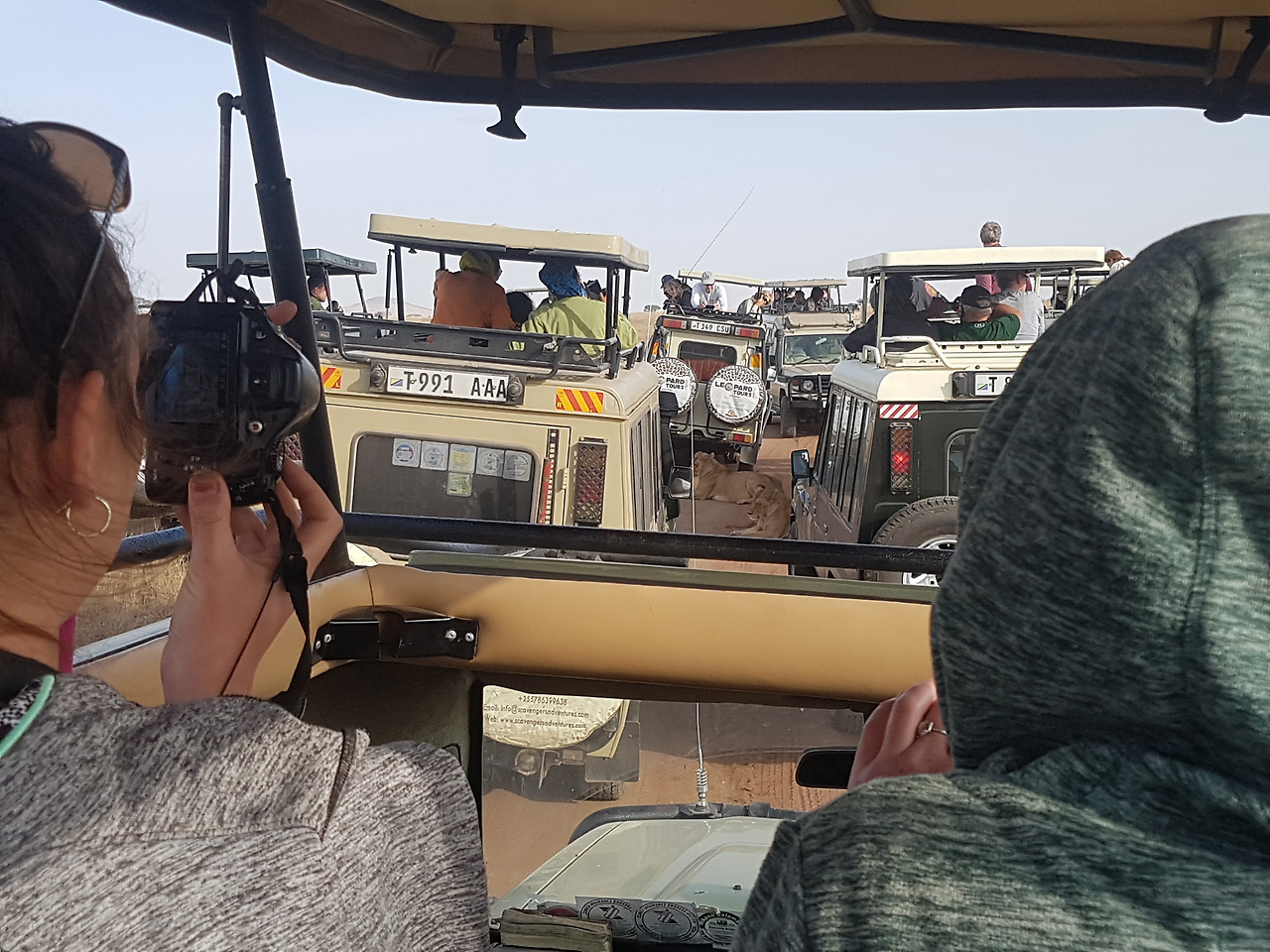 '트럭들이 많이 모인 곳에는 엄청난 것이 있다.' 이것은 사파리의 변치 않는 진리이다. 우리도 트럭들이 떼를 지어 모여 있는 곳에 차를 세웠다. 처음에는 뭘 보는 것인지 잘 파악이 안 되지만 모두의 카메라가 향하고 있는 곳을 자세히 들여다보면 새로운 세계가 펼쳐진다. 이번에도 사자다. 하지만 그토록 보고 싶었던 수사자다. 그것도 살벌하게 아침 식사 중인 수사자와 암사자 무리들 말이다!