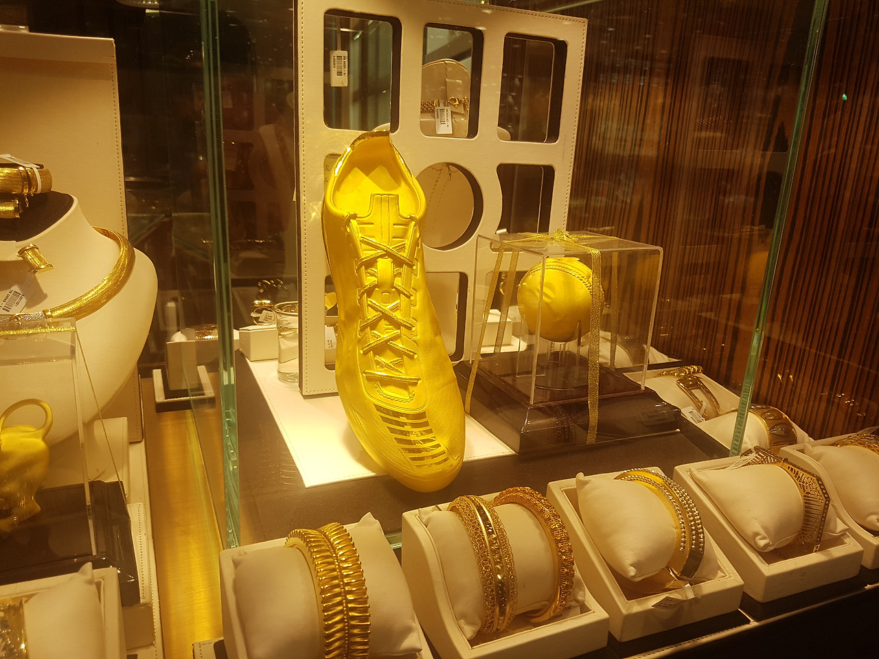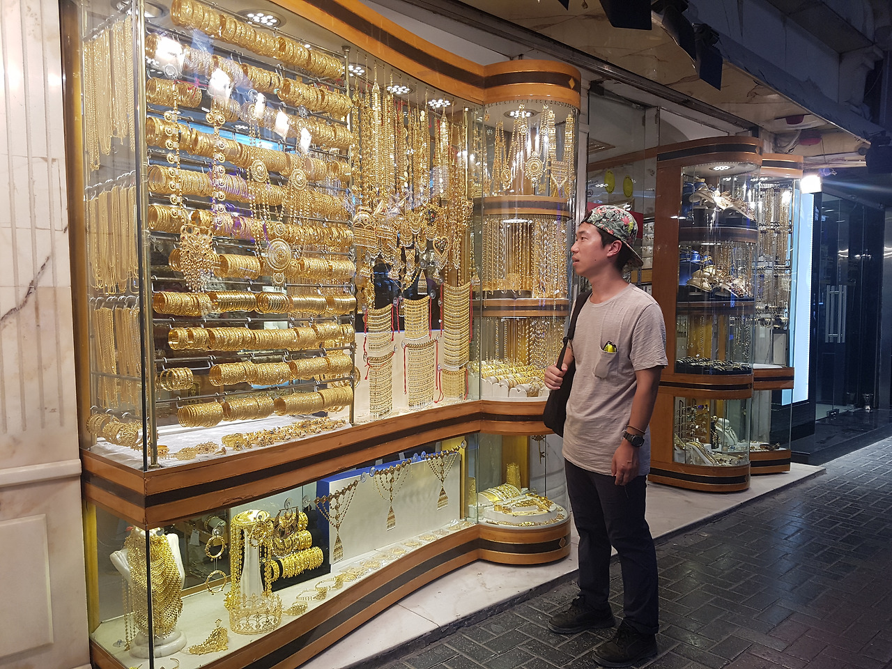 다음 나라로 향하는 비행기가 새벽 출발이라 시간을 때우기 위해 방문한 곳은 '골든 속 Gold Sok'. 인근 국가 인도 사람들도 몰려와 금을 산다는 두바이의 유명한 금시장 되시겠다. 도착하자마자 일단 휘황찬란한 쇼윈도에 넋이 한 번 나가 주시고, 눈이 부셔서 쳐다 보기도 부담스러운 금 축구화와 야구공에 나갔던 넋이 돌아오는 놀라운 경험을 했다. 그리고 한약방 거리에서 한약 냄새를 습습하고 들이마시면 건강해지는 듯한 느낌이 들듯 금시장 거리에서 금빛을 와와 하며 쳐다보니 부자가 되는 듯한 느낌이 들었다. 세상에 이 많은 금이 다 어디서 나는 거람. 저런 금팔찌 차면 팔목 무겁고 참 좋겠다ㅋ