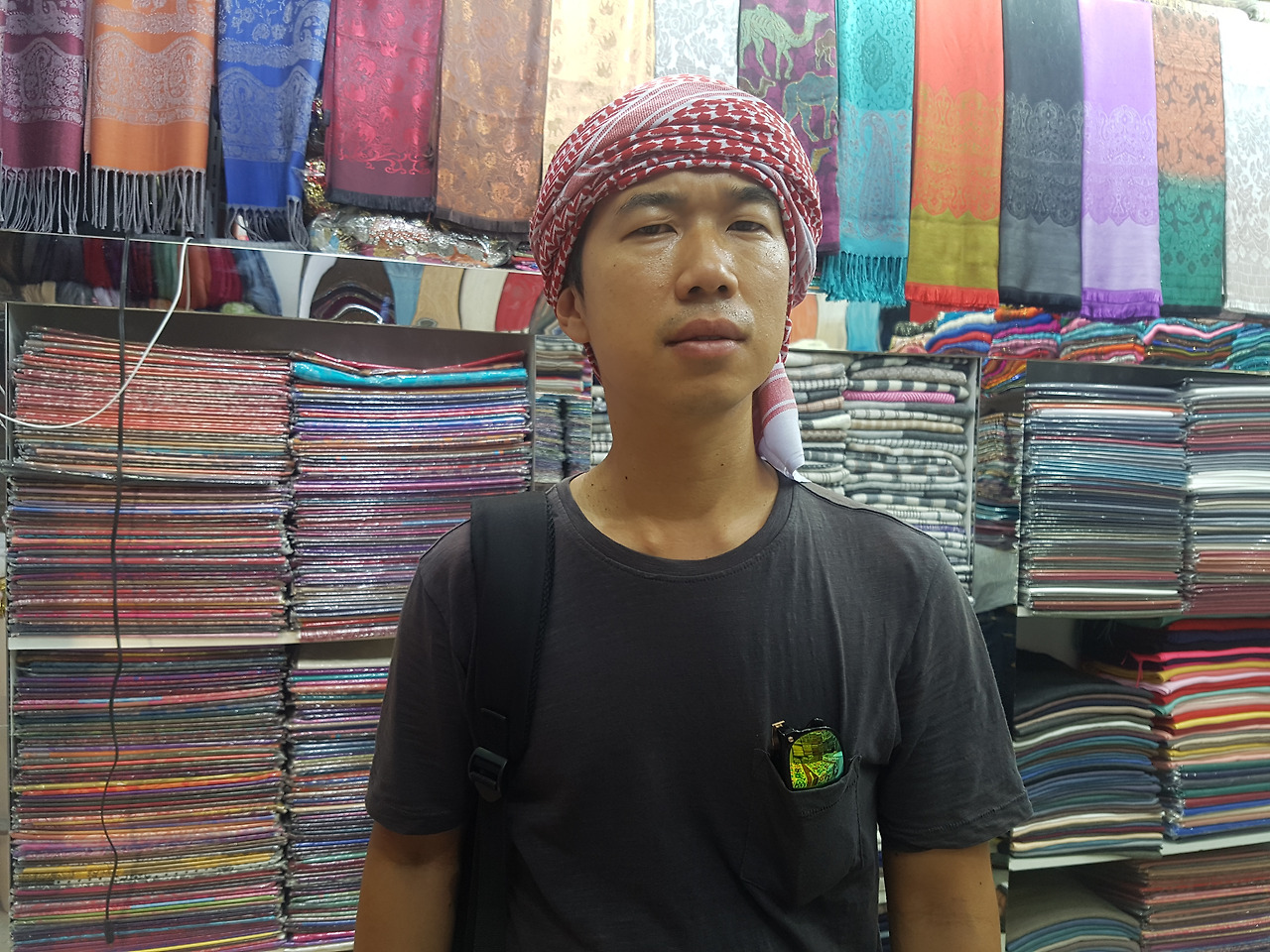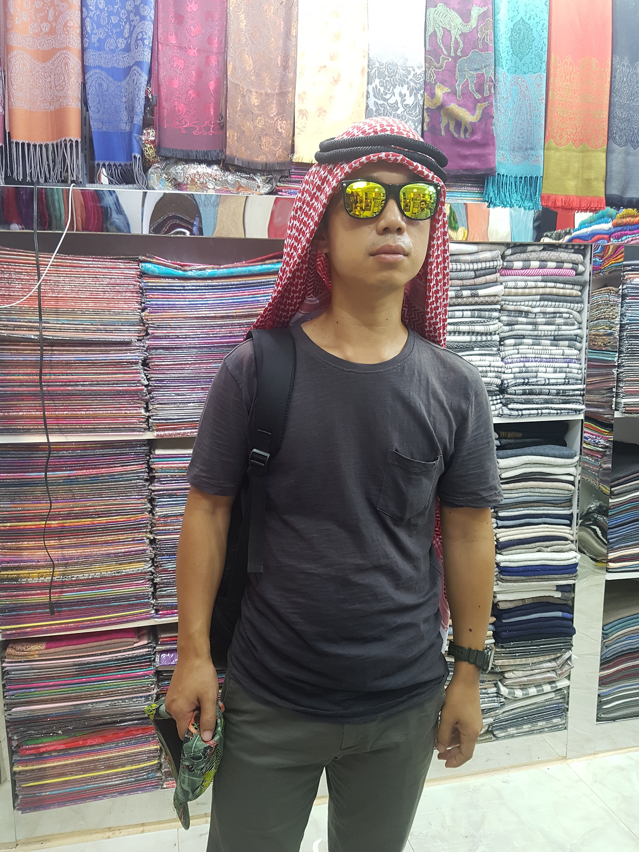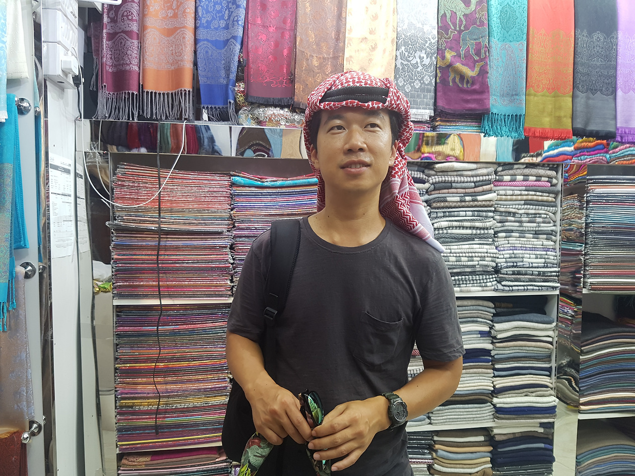 '이따 오겠다. 이미 샀다.' 등의 말로 겨우 장사꾼들을 떼어냈는데 열 걸음도 못가 터번과 스카프를 파는 한 아저씨에게 또다시 붙들리고 말았다. 아저씨는 아주 능숙한 손놀림으로 남편의 머리에 터번을 올린다. 그리고는 거울을 보여주겠다고 에어컨이 빵빵한 실내로 우릴 이끈다. 아, 쾌적하다. 한참 더위에 지쳐 있던 우리는 차갑고 보송보송한 에어컨 바람에 일단 정신이 혼미해졌다. 그 틈을 타 아저씨는 총 세 가지 버전으로 터번을 스타일링해주셨고, 남편은 거의 사기 직전까지 가고야 말았다. 지갑 열뻔;;