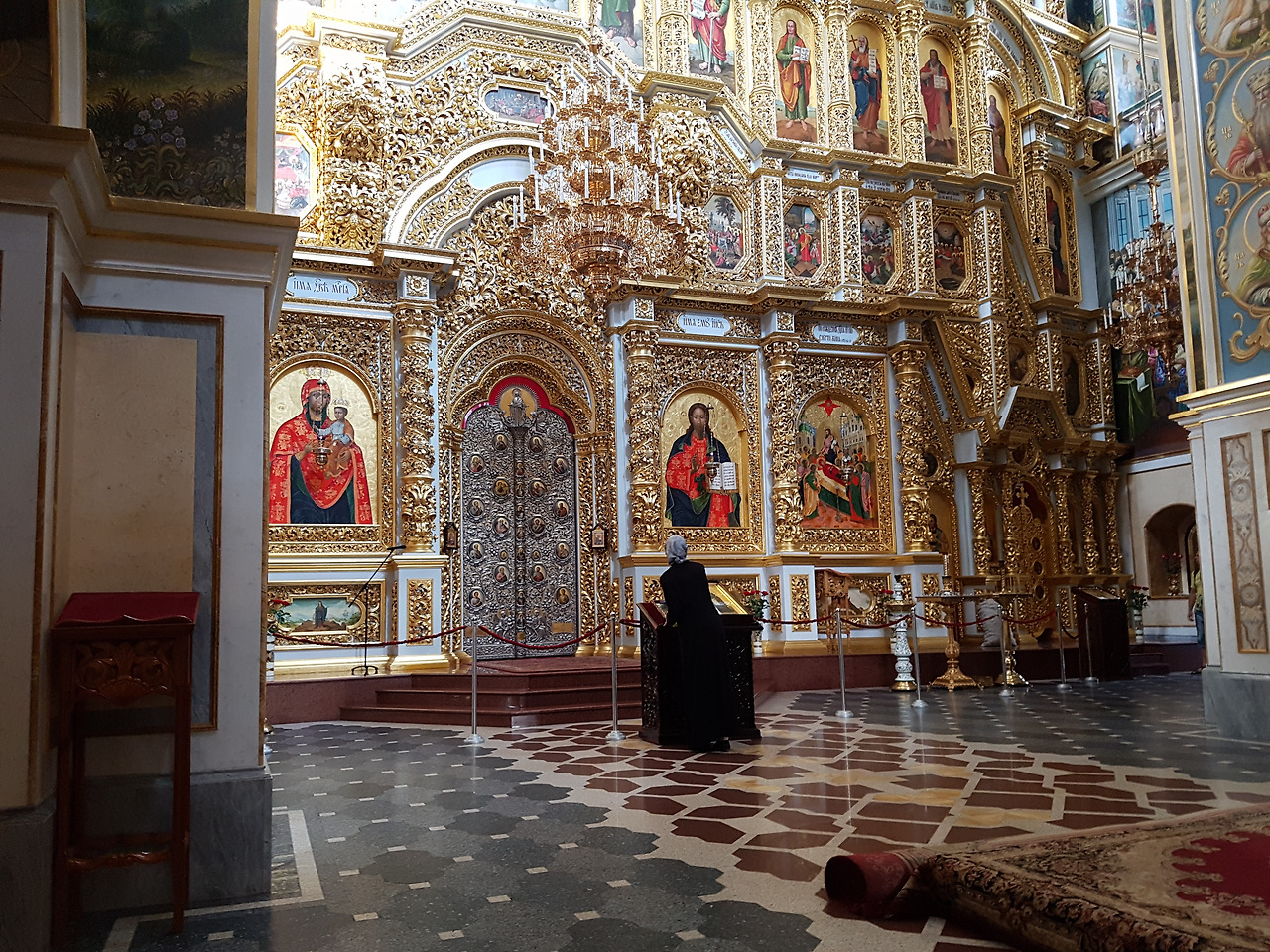 조심스럽게 들어선 성당 내부에는 성인들의 그림이 가득했다. 천장과 벽 그리고 기둥까지 곳곳에 그려진 이 성인들의 그림은 '아이콘 Icon'이라고 불리며 '동방정교회' 성당이 가진 특징 중 하나이다. 그들은 이 그림을 신과의 소통의 매개체로 여기기 때문에 성당에 들어서면 유리함에 보관된 그림에 입을 맞추고 손수건으로 닦는 간단한 기도 의식을 진행한다. 우리가 성당 안으로 들어갔을 때도 단정히 머릿수건을 한 여성분이 아이콘에 입을 맞추며 기도를 하고 계셨다. 그녀의 소박한 옷차림과 화려한 실내 장식이 만들어내는 극명한 대비가 참 인상 깊었다.
