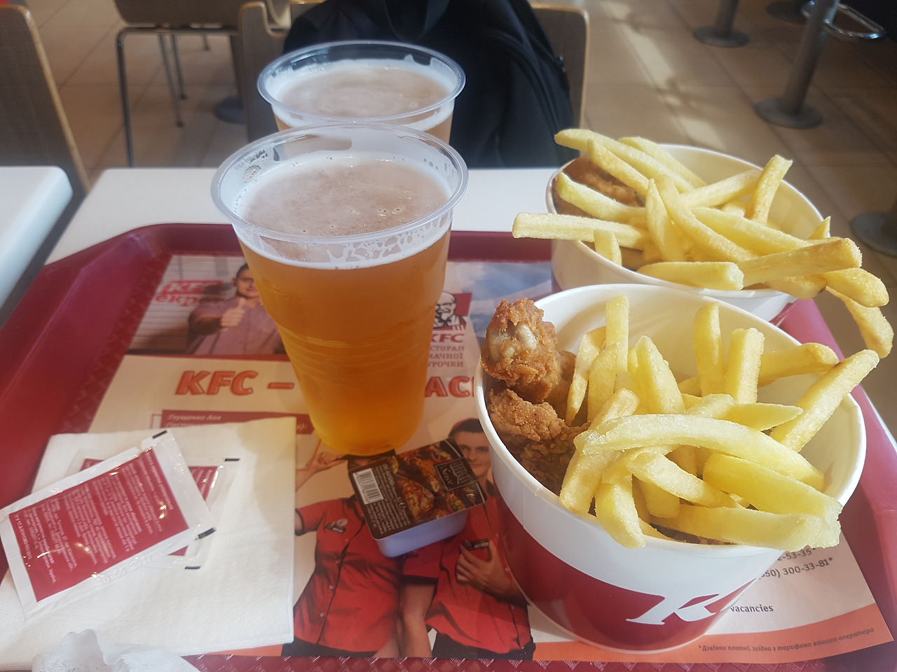 어마어마한 동상과의 데이트를 마친 뒤 저녁을 먹기 위해 KFC로 향했다. 사람들이 가장 많이 먹는 치킨 5조각에 감자칩이 들어있는 메뉴가 65흐리브나(약 3,000원), 맥주 500ml 한잔은 22흐리브나(약 990원). 1인당 4천 원에 치킨과 감자칩 맥주까지 배불리 먹을 수 있는 이 나라는 도대체 정체가 무엇일까. 식자재가 얼마나 풍요로우면 이런 가격이 형성될 수 있는 것일까. 정말 우크라이나 물가는 사랑이다.