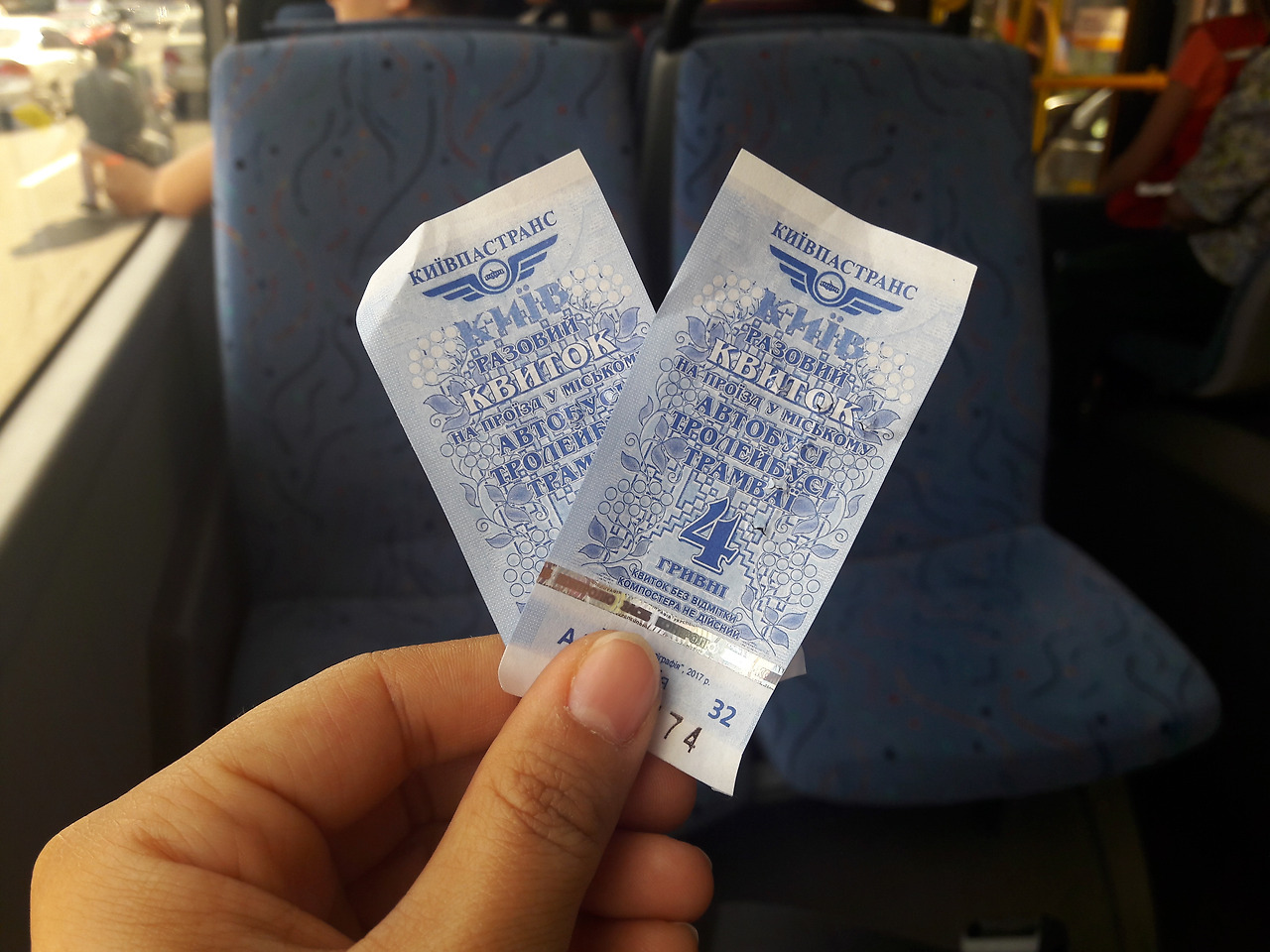 둘째 날 아침, 본격적인 키예프 탐방을 위해 호스텔 바로 앞에 있는 정류장에서 버스를 탔다. 우크라이나의 버스에는 태국처럼 직접 돈을 받고 티켓을 발급해주는 직원이 상주해 있었다. 가격을 물어보니 4흐리브나(약 180원)란다. 엄청난 저렴함이다. 게다가 티켓도 예쁘다. 이렇게 받은 티켓은 버스 기둥에 달려있는 확인 기계에 넣고 꾹 눌러 탑승했다는 표시를 남겨 주어야 한다. 그렇게 하지 않고 계속 재탕 삼탕으로 티켓을 쓰면 나중에 불시 검문에 걸려 벌금을 내야 할지도 모르니 주의해야 한다.
