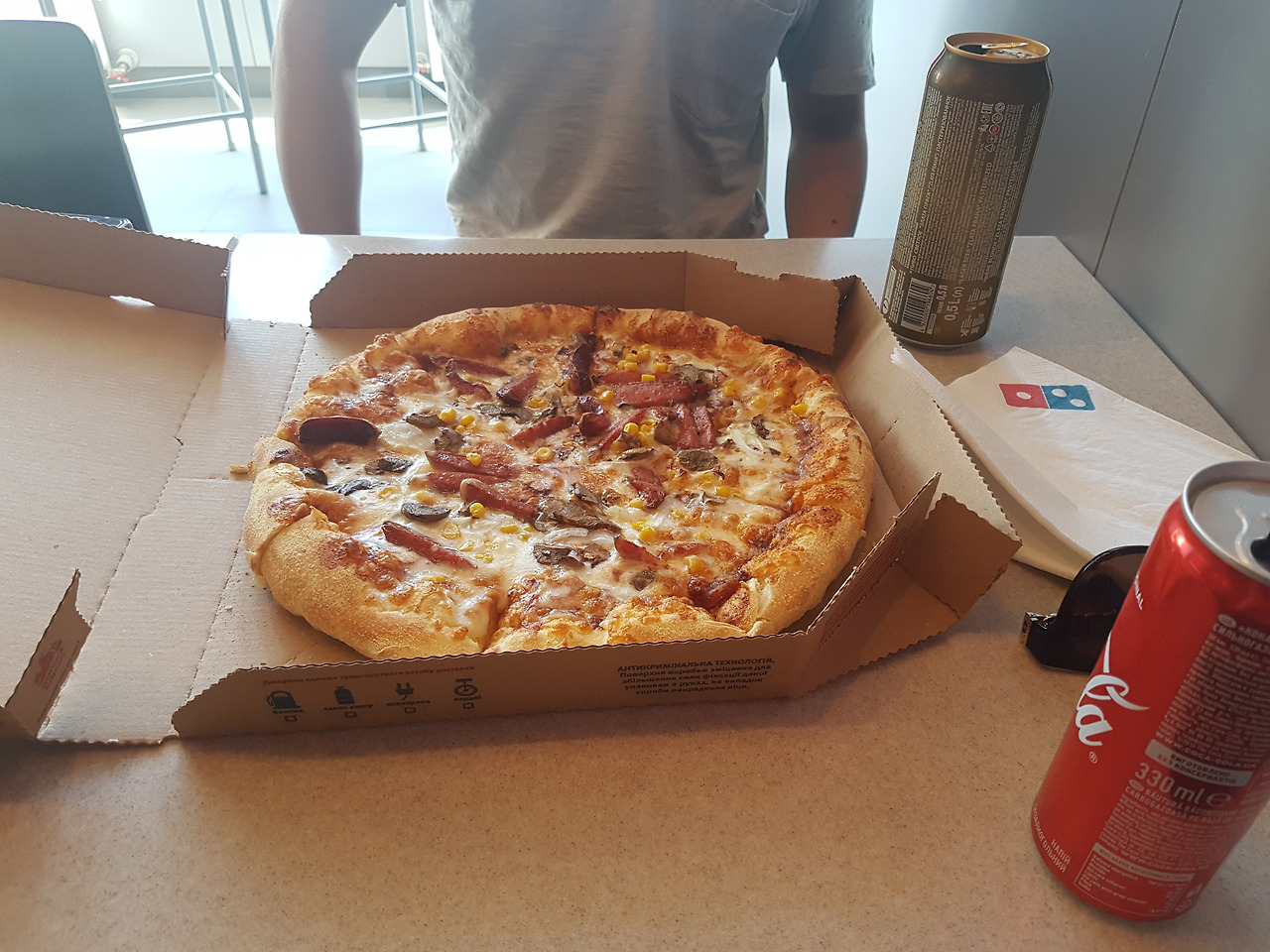 침대 배정받기까지 대략 6시간이 남은 우리는 호스텔을 나와 아침을 먹기 위해 근처 도미노 피자에 갔다. 나는 영어를 전혀 못하는 직원에게 영어와 바디랭귀지로 주문을 했고, 직원은 러시아어를 전혀 못하는 나에게 오로지 러시아어로만 이야기했다. 그래도 끝까지 내 의도를 파악하기 위해 이것저것 손으로 가리키며 최선을 다하는 모습에서 또다시 츤데레의 냄새가 솔솔 피어올랐다. 피자도 겉보기엔 평범하기 그지없었지만 꼬다리 빵만 먹어도 풍미가 느껴지는 엄청난 퀄리티를 자랑했다. 거기다 미디움 한판+맥주 한 캔+콜라 한 캔이 172흐리브나(약 7,740원)로 가격까지 합리적이다. 도착해서 이제 아침만 먹었을 뿐인데, 매력이란 것이 폭발한다.