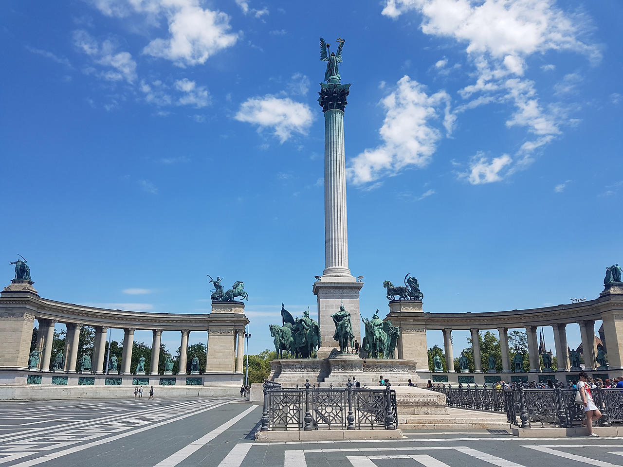 지현 언니가 정성껏 차려준 짜장밥과 된장국을 먹고 다 같이 '영웅광장 Heroes Square'까지 걸어갔다. 날은 조금 더웠지만 하늘이 맑아 광장이 더욱 웅장해 보였다. 이곳은 1896년 헝가리 건국 1000년을 기념하기 위해 세워진 광장인데 중앙에 위치한 36m의 탑 꼭대기에 대천사 가브리엘의 조각상이 올려져 있다. 광장 주변으로는 역대 왕과 영웅들의 조각상이 순서대로 나열되어 이곳의 역사적 중요성을 상기시켜준다.