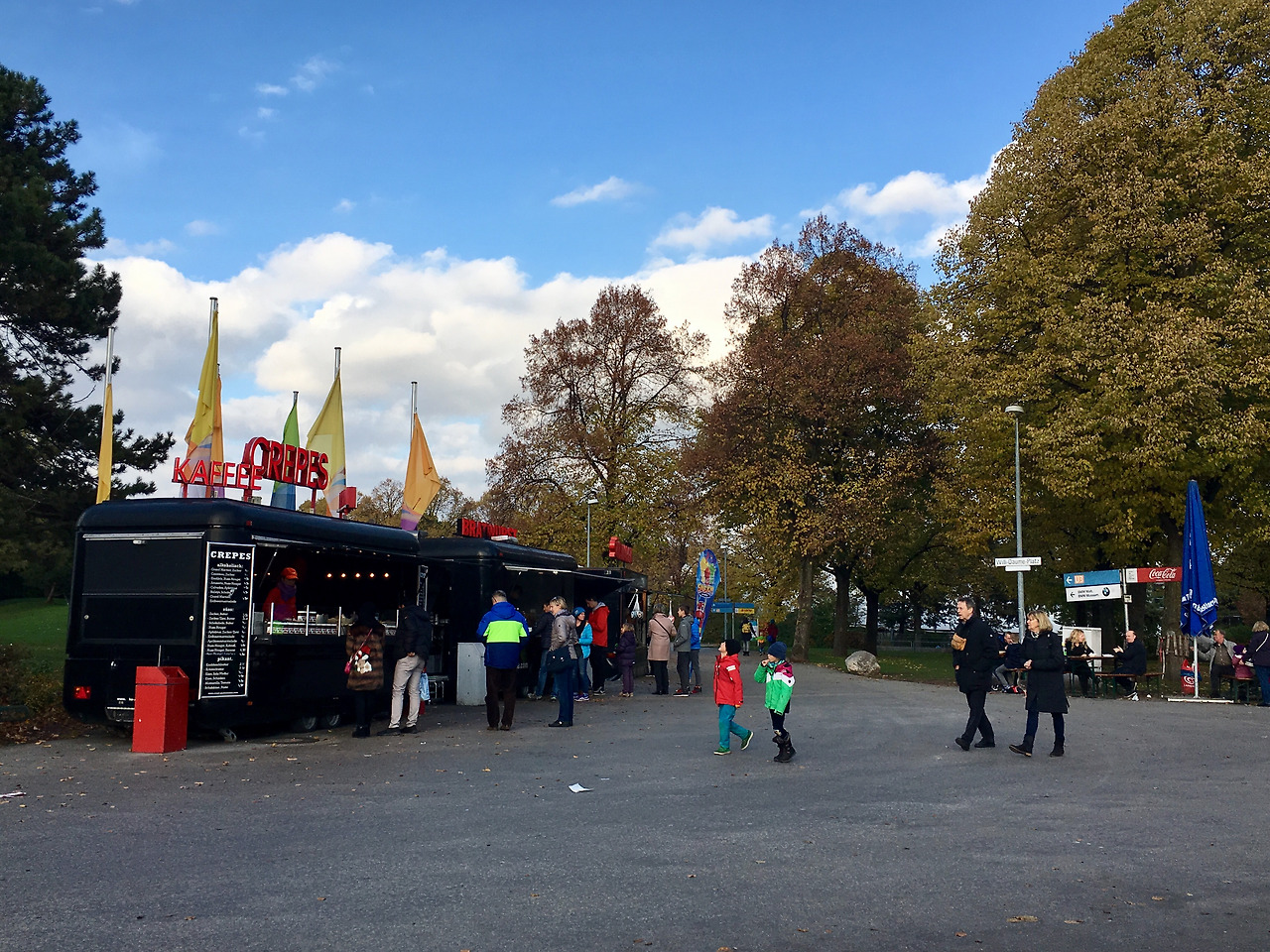 푸드 트럭에서 크래페, 커리부어스트, 맥주, 과자 등을 판다