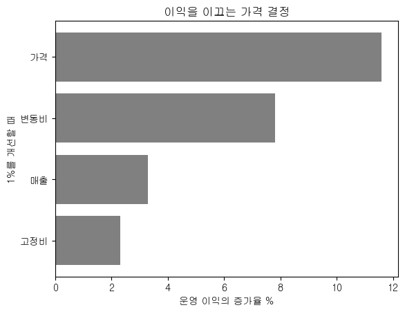 경영자가 어떤 요소든 개선할 수 있다면 이익에 가장 큰 영향을 주는 것이 가격입니다. 연구결과를 보지 않았더라도 사업을 하는 사람들은 대충 짐작하고 있는 사실입니다.