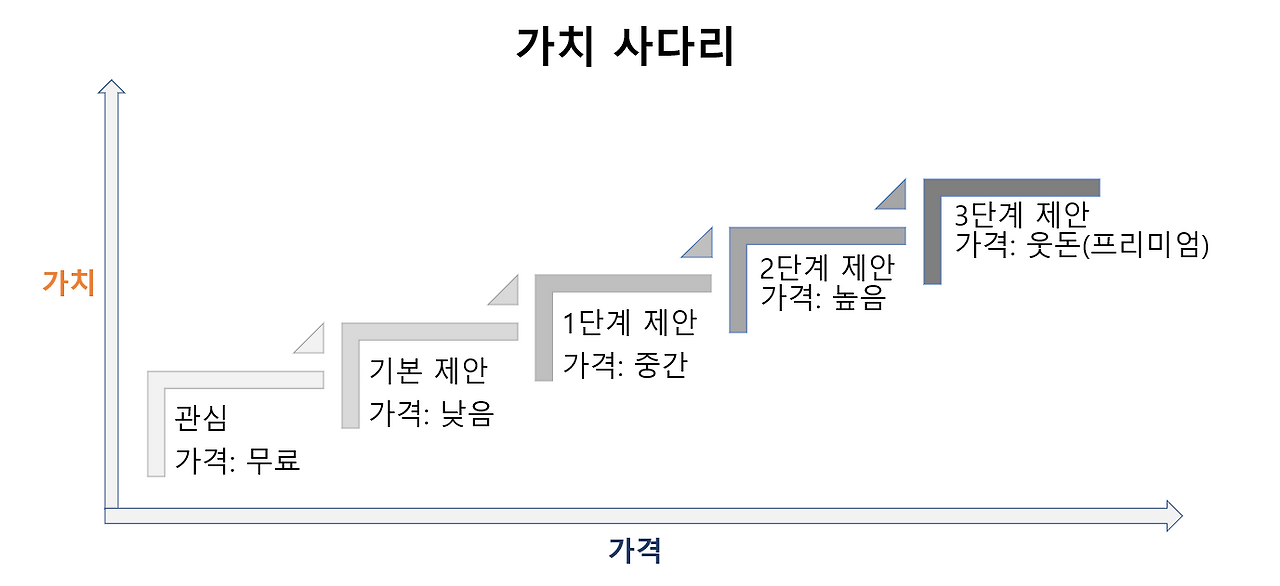 가치 사다리는 브랜드를 가치제안으로 전환한 도표입니다. 가치 사다리의 세로축은 고객에게 이익이 되는 가치, 가로축은 가격을 나타냅니다. 고객에게 가치가 적으면 가격이 낮고, 가치가 추가될수록 가격은 더 올라갑니다. 가치 사다리를 이용하여 고객에게 맞춤형 가치제안을 함으로써 고객만족도를 높이고 회사는 더 높은 이익을 낼 수 있습니다.
