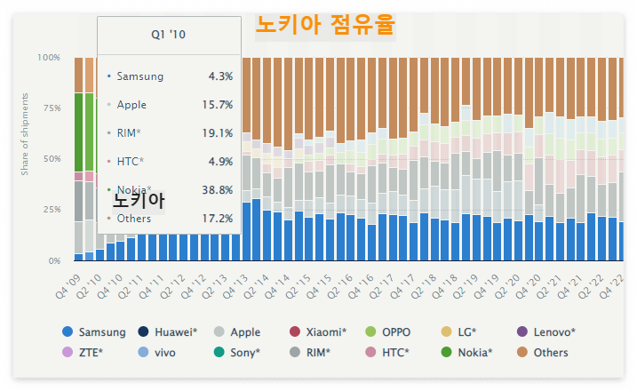 2010년 점유율 38.8%에서 1% 이하로(출처: www.statista.com/)
