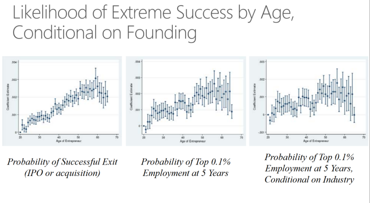 그림은 Pierre와 Xue Li가 연구한 창업가의 나이 분석이다. 가장 왼쪽 그림은 창업을 한 후 기업공개(IPO)또는 기업 매각을 기준으로 성공률을 분석한 것이다. 그림의 가로축은 20대에서 70대까지의 연령대를 나타낸다. 세 개의 그래프는 나이 든 창업가들의 성공률이 높음을 보여준다. 이 연구에 따르면 나이 들어서 창업할수록 성공가능성이 높다고 말한다. 성공한 창업가의 창업 당시 나이는 평균 42살이었다.