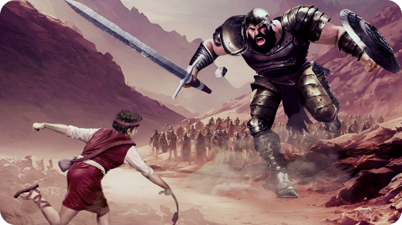 기원전 약 1030년 경, 키가 2미터 92센티미터인 골리앗은 거대한 창을 들고 투구와 갑옷으로 무장하고 있었다. 블레셋 진영에서 이 거인 병사가 나와 도발하자 사울의 군대는 기가 죽었다. 그 결말은 잘 알려져 있다. 양치기 소년이었던 다윗이 골리앗을 물리치고 이스라엘 최초의 왕이 된다. 사울은 명목상 최초의 왕으로 기름 부음(왕이 될 특별한 인물을 표시하는 행위)을 받았지만 역사는 전사 왕 다윗을 리더로 기억한다.