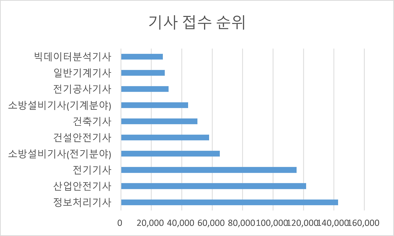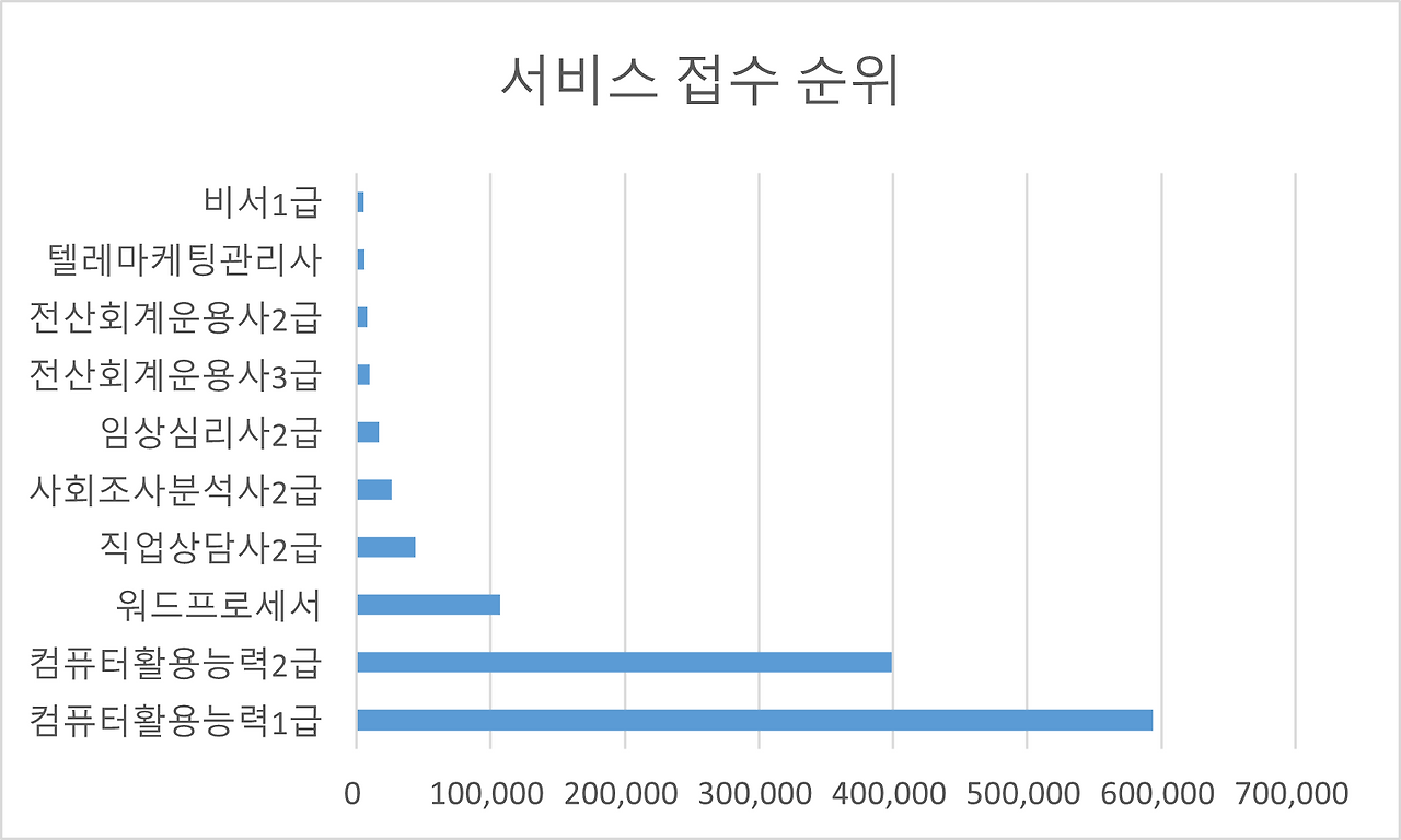 자격증 접수가 가장 많은 순위이다. 이미 말했듯이 컴퓨터활용능력은 중고등 학생들이 많이 본다. 그 외 8개 자격증은 취업이나 창업에 직접 도움이 되는 자격증으로 인기가 높다.