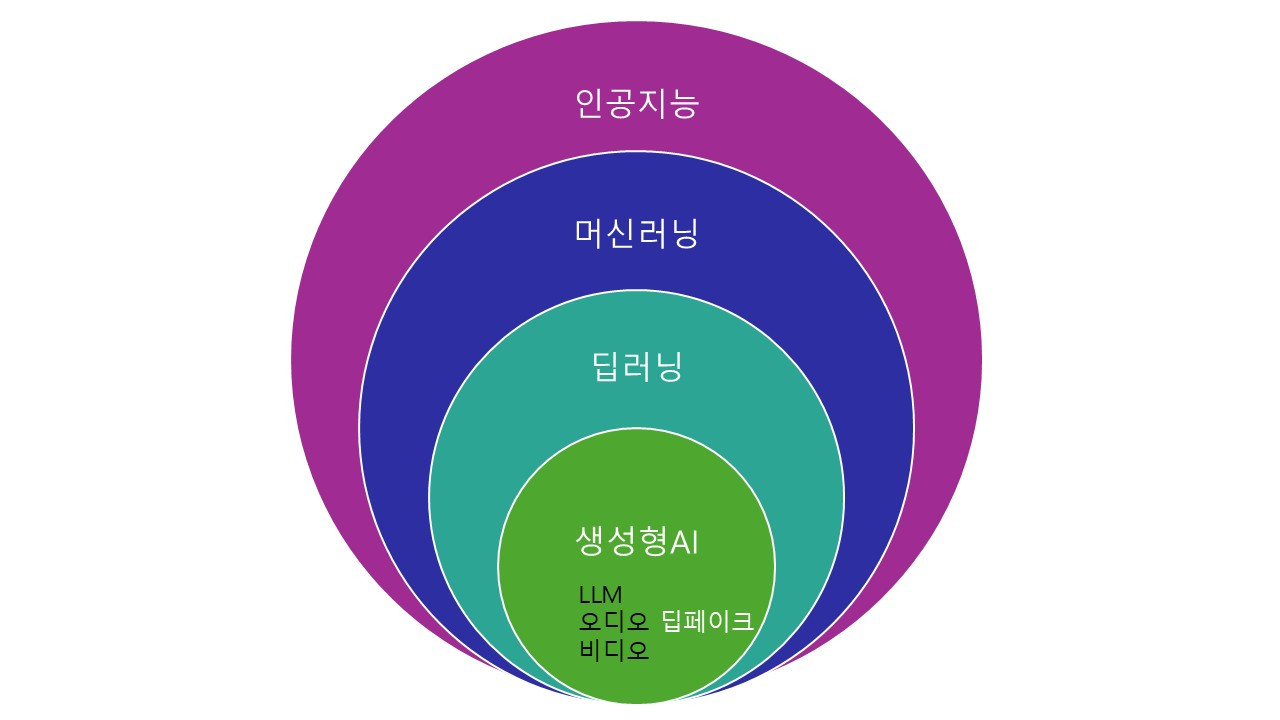 2010년대부터 머신러닝과 딥러닝이 출현하였고, 2020년대부터는 생성형AI가 상용화 되며 AI발전을 선도하고 있다. 위의 용어를 벤다이어그램으로 나타내면 아래와 같다.
