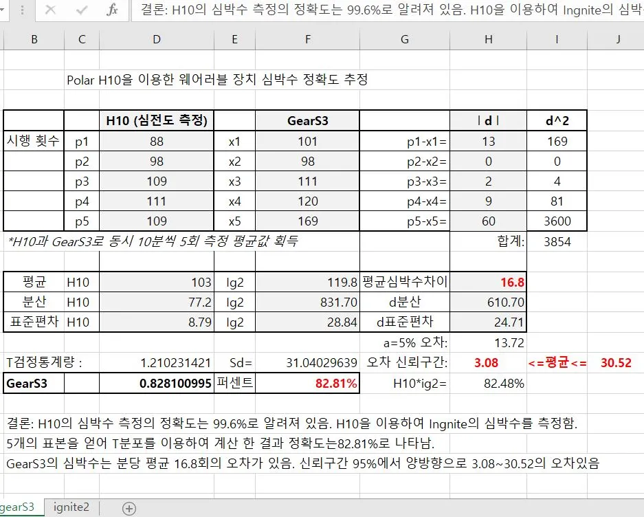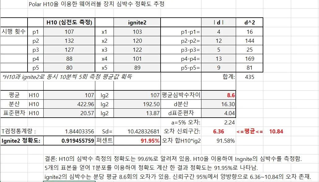 그럴 것이라고 생각했던 대로 실험 결과는 삼성보다 폴라의 심박수 정확도가 높게 나왔다. 내가 평소에 차고 있는 폴라 시계는 정확도가 91.95%로 나왔고 전에 차던 삼성 시계는 82.81%로 나왔다. 5번씩 밖에 시행을 안 했기 때문에 일반화 하기는 어렵다. 분석 방법은 자격증을 딸 때 공부했던 통계 책을 찾아서 식을 대입했다. 엉성한 실험이지만 재미있었다. 초등학교 때부터 대학생때까지 나는 수포자(수학 포기자)였다. 수학에 때문에 언제나 움추러 들었었다. 학창 시절에도 포기했던 통계를 다뤄보니 나의 약점 하나를 극복한것 같은 기분이 든다.