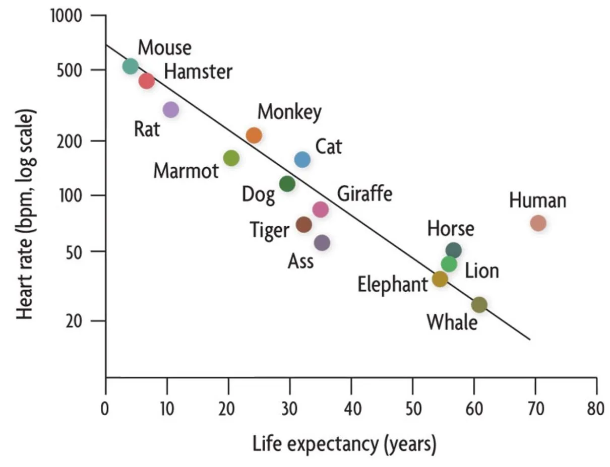 아래 그림은 1997년에 발표된 한 논문이다. 동물들의 분당 평균 심박수와 수명을 나타낸 그림이다. 분당 심박수가 높을수록 수명이 짧다. 생쥐는 심박수가 분당 500회를 넘고 예상 수명은 2년이다. 고래는 심박수가 20회이고 예상 수명이 60년이다. 재밌는 것은 일생 동안 총 심박수는 쥐 나 고래나 비슷하다는 점이다. 동물들은 일생 동안 10억 번 심장이 뛴다.