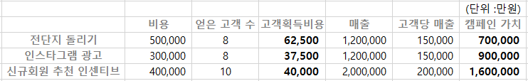 고객획득비용은 비용을 얻은 고객 수로 나눈 값입니다. 전단지 돌리기는 비용이 높은데 비해 얻은 고객의 수는 적어서 고객획득비용이 높으며 캠페인 가치는 가장 낮습니다. 인스타그램 광고는 비용이 낮은데 비해 많은 고객을 얻었습니다. 마지막은 기존 회원에게 신규회원을 추천하도록해서 실제로 등록하면 인센티브를 주는 방법입니다. 고객획득비용은 중간이지만 얻은 고객은 가장 많습니다. 동일한 예산으로 다음달도 캠페인을 벌인다면 전단지 돌리기를 중단하고 인스타그램 광고를 늘리는 것이 나은 선택일 것입니다.